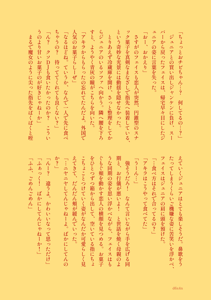 d6x4n☆quiet followDONE◆おやつのフェイジュニふたりで暮らすふたりがおやつを食べるお話しです!(パロディのため苦手な方はご注意ください) show all(+1 images) Tap to full screen (size:2664x3780).Repost is prohibited Let's send reactions! freqpopularsnackothersPayment processing Replies from the creator Follow creator you care about!☆quiet follow d6x4nDONE2022.02.12「Rockなキミにショコラを添えて2」 小説展示🎧さんお誕生日おめでとうございます!①ホテルで夜を過ごすフェイジュニのお話しです!事後表現、うっすらそういった表現があります。18歳以上の方は【yes】でどうぞ! 3 d6x4nDONE2022.02.12「Rockなキミにショコラを添えて2」 小説展示③突然に🎸からお誘いを受けるフェイジュニのお話しです!うっすらとそういった表現があります。18歳以上の方は【yes】でどうぞ! 3 d6x4nDONE2022.02.12「Rockなキミにショコラを添えて2」 小説展示②2/14早朝のキースさんとフェイジュニのお話しです!昨年のワンドロライさま生誕企画の際に載せたものを加筆修正しております! 3 d6x4nDONEフェイジュニ♀ふたりで暮らしている🎧くんが夏バテになるお話しです! 4 d6x4nDONEフェイジュニ ワンライ お題▶寝不足 をお借りしました!大学生🎧🎸に巻き込まれる🍺さんのお話しです!現パロ、飲酒描写がありますので苦手な方はご注意ください。 3 d6x4nDONE◇朝のフェイジュニふたりで暮らすふたりがケンカをした次の日の朝のお話しです!(パロディのため苦手な方はご注意ください) 4 recommended works diodio_0807DOODLE⚠️ふた、女攻女噴🔞 2 komekoexDOODLE秋のえろ祭りフォロワリク触手姦のえっちなサンポ18↑?y/n 2 13tbcDOODLE新スナさんアイスを食べるだけですとっても健全。(笑) 2 piyoriDONE付き合ってるレイマクと🍄くんと🐬くん「もう、お前といない自分を想像することもできねぇ」な☔くん 8 🐙🐙🐙DONE羊猫ワルツ9開催おめでとうございました!謎のレノファウ漫画です(クロエもでてくる)ほぼ白くてすみません… 6 ★蒼★DOODLEなんとなく描いた少年侍。 はるかぜゆえTRAINING2024/08/25 ユーウMEMO 夜猫冬日见DOODLE【all左】left博主的聊天记录2 6