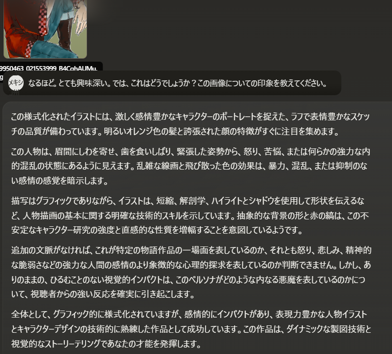 240517 AIのClaudeに絵の感想を述べてもらった。めちゃめちゃ褒めてくれるからモチベーション上がる~。ポーズや表情からいろいろ読み取ってもらえて嬉しいね。
