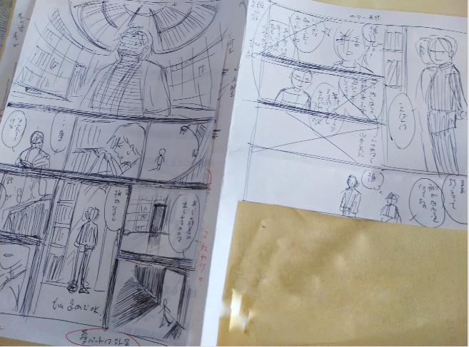 2023.8.18 ネーム直し。空きスペースの紙を切り取って貼るどちゃクソアナログ方式。何度も読み返して要らない台詞削ったり、絵を差し替えたりしているけど、正解が全く分かんない。そんで1pあたりのコマ数が減らない