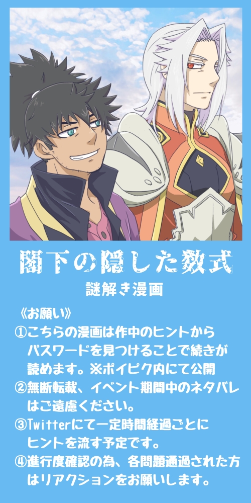greenpeoplegen☆quiet followDONE閣下の隠した数式①※問題が解けましたら②にお進みください《ご注意》作品内では謎解きのためテルカリュミレースを英語表記世界として取り扱っています。そのため謎の文字がアルファベット、アラビア数字で書かれています。 #アップルグミ感謝祭 appleGummyThanksgiving show all(+1 images) Tap to full screen (size:500x1000).Repost is prohibited Let's send reactions! freqpopularsnackothersPayment processing Replies from the creator Follow creator you care about!☆quiet follow greenpeoplegenDONE表情練習タグのラスト!⁽⁽ଘ( ˊᵕˋ )ଓ⁾⁾閣下とおっさんえちちレベル低い人間が頑張って描いたけどこれエロ顔って言ってええんかな…😇お口でちょっとアレしてるので一応伏せますわよ!🙃表示がアレ過ぎたので刻み海苔足しました!🙇(2023/10/5)Pass:age18↑? 2 greenpeoplegenPAST過去に描いた猫っぽいのまとめ 11 greenpeoplegenDOODLE自己満足する為に描いた閣下 greenpeoplegenSPOILERレイズさん最新話とあるシーンの殴り描き😇妄想が具現化したかと思ったわよ… greenpeoplegenTRAININGアイビスさんに人型トレス素材増えたから女子の練習兼ねて出来心で描いたにょっさん他です🙃(にょ化注意)お話しながら描いてたら盛りっと増えたのでここにポイっとしました!トップは前に髭描き損ねちゃったので追加したやつを丁度いいので置いただけなので中身は別に見せられます😇 6 greenpeoplegenSPOILERレイズさん4部16章-5ネタバレ。興奮と勢いだけで描きました⁽⁽ଘ( ˊᵕˋ )ଓ⁾⁾ related works たかのアキDONE【全年齢】ディムスタ漫画、オンラインイベント「アップルグミ感謝祭」合わせの新作です。【2021/08/21】原作ED後に、ディムロスが人の姿で帰ってきて、2人旅をしている…という設定です。 3 greenpeoplegenDONE閣下の隠した数式⑤ ※④の問題に対してのおっさんのこたえがパスワードとなりますこのお話はこれでおしまいです。ご参加、ご閲覧ありがとうございました! 8 たかのアキDONE【R18】ディムスタ漫画、オンラインイベント「アップルグミ感謝祭」合わせの新作です。【2021/08/21】 4 greenpeoplegenDONE閣下の隠した数式 BAD END隠されたメッセージが解けなかった場合のエンディングです。ご参加、ご閲覧ありがとうございました! 2 ヒノ(ロクミハシコ)MENU2023/7/1開催アップルグミ感謝祭3お品書きなどペーパーラリー企画参加。既刊・既グッズ有。当日エアスケブ受付ます。よろしくお願いいたします! 3 greenpeoplegenDONE閣下の隠した数式③※②の問題の答えがパスワードとなります。 greenpeoplegenDONE閣下の隠した数式②※①の問題の答えがパスワードになります(4桁の数字)※解けましたら③にお進みください greenpeoplegenDONE閣下の隠した数式④※③の答えがパスワードとなります※解けましたら⑤にお進みください 4 greenpeoplegenDONE閣下の隠した数式①※問題が解けましたら②にお進みください《ご注意》作品内では謎解きのためテルカリュミレースを英語表記世界として取り扱っています。そのため謎の文字がアルファベット、アラビア数字で書かれています。 2 recommended works wanjinyuhuaDOODLE扒拉出来这个,魅魔安姐x龙雷 4 greenpeoplegenDONE閣下の隠した数式①※問題が解けましたら②にお進みください《ご注意》作品内では謎解きのためテルカリュミレースを英語表記世界として取り扱っています。そのため謎の文字がアルファベット、アラビア数字で書かれています。 2 greenpeoplegenDONE閣下の隠した数式 BAD END隠されたメッセージが解けなかった場合のエンディングです。ご参加、ご閲覧ありがとうございました! 2 たかのアキDONE【R18】ディムスタ漫画、オンラインイベント「アップルグミ感謝祭」合わせの新作です。【2021/08/21】 4 たかのアキDONE【全年齢】ディムスタ漫画、オンラインイベント「アップルグミ感謝祭」合わせの新作です。【2021/08/21】原作ED後に、ディムロスが人の姿で帰ってきて、2人旅をしている…という設定です。 3 MahaDOODLEold trash ぽてぽてDONER-18ペパアオ 毎回怪我して帰ってくるアオちゃにキレるペお仕置セッ とその後の甘やかし元ネタ提供:キムチの素さん素晴らしい壁打ちをイラスト化する許可をいただき、描かせていただきました😭❤️🔥元ネタからちょっとだけ変わっちゃってる所もありますごめんなさい💦💦 5 ヒノ(ロクミハシコ)MENU2023/7/1開催アップルグミ感謝祭3お品書きなどペーパーラリー企画参加。既刊・既グッズ有。当日エアスケブ受付ます。よろしくお願いいたします! 3 konoha_reireiDOODLE
