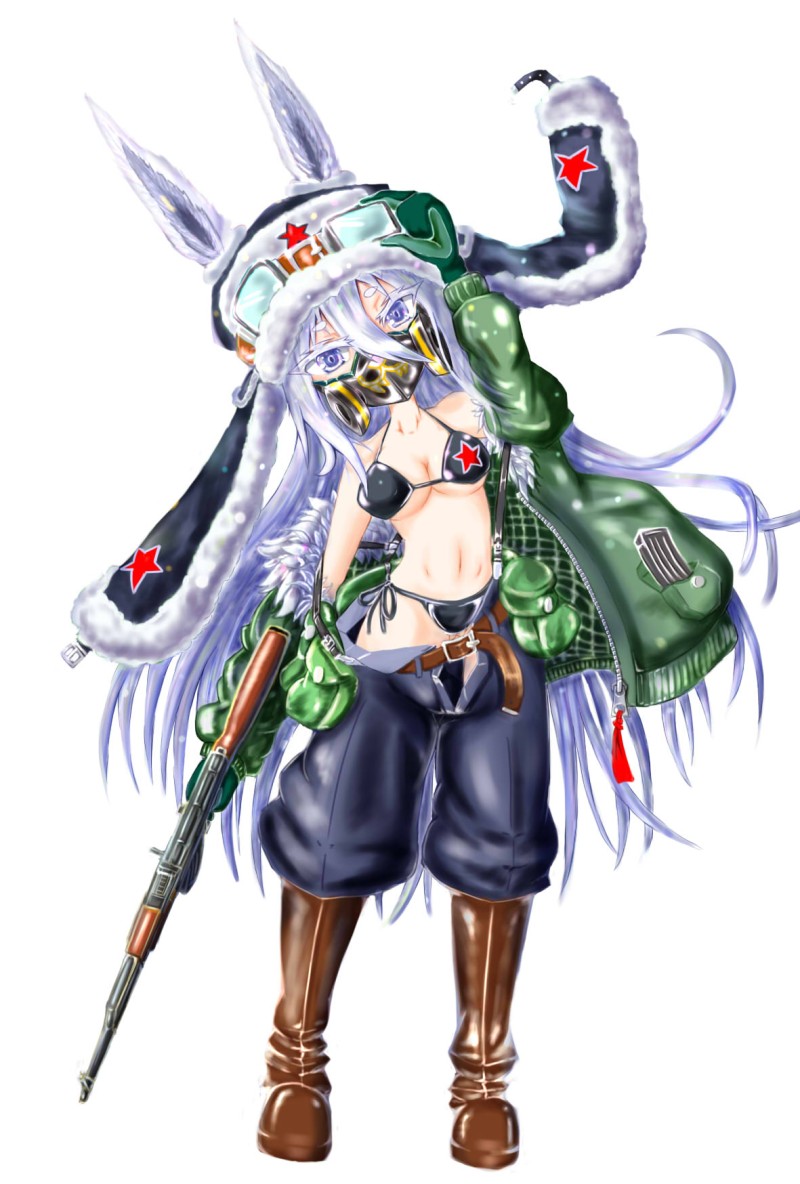 #オリジナル #オリキャラ #創作 #創作キャラ #過去絵 #銀髪 #ケモミミ #ビキニ #軍人 #兵士 #銃 #AK #ブーツ #カラーイラスト