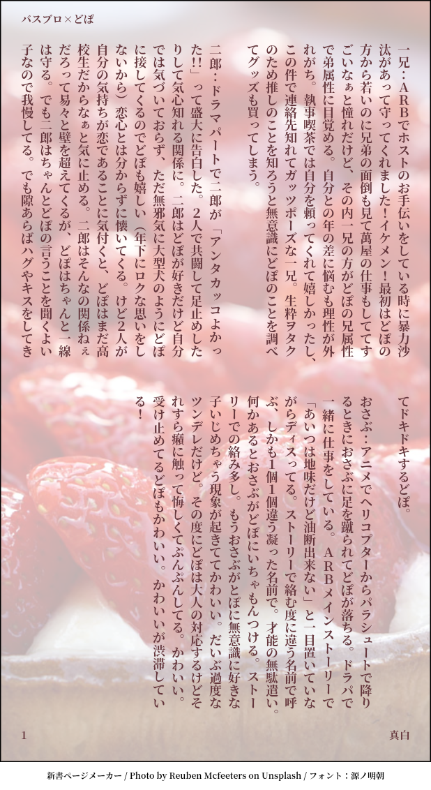 mashiro28☆こそフォロ過去のを晒す独受けイベントで色んなどぽ受けを知ってほしくてハマるポイントや接点などを書き綴ったものです。シンジュクを除く全ディビジョンのを掲載しています。 #ヒ腐マイ すべて表示(+4枚) タップで全画面(原寸:618x1132)無断転載禁止 リアクションをたくさん送って応援しよう! よく使う人気おやつその他支払処理中 作者からのリプライ 気になる人をどんどんフォローしよう!☆こそフォロ mashiro28過去のを晒す独受けイベントで色んなどぽ受けを知ってほしくてハマるポイントや接点などを書き綴ったものです。シンジュクを除く全ディビジョンのを掲載しています。 5 mashiro28過去のを晒すハマ独。愛し方が狂ってるハマ。 4 mashiro28らくがき空独📿👔未満これでお互いの価値観が寄り添うといいなぁって。 4 mashiro28過去のを晒す三独。おさぶお誕生日おめでとう!! 9 mashiro28らくがき謎の背中シリーズ。 3 同じタグの作品 tsuzuri0505らくがきろしょ 8_bee@はちべできた #ヒ腐マイ #帝理 #小説 帝統に気を許して寝てしまう理鶯の話。 3 星を見つめる184らくがきぽふ※Twitterフォロワー限定です 2 auk_pらくがきジカピのクソデカ感情丸 johnsbkn8できた 太刀川 剣らくがき三郎「!!!」二郎「さっきの仕返し♡」三郎「(ムカつく////)」 nodahrtらくがきハッピーサマイチが好きです^_^ 2 _date_info作業進捗三つ巴な原稿できた……… 白傘ゆきおらくがき攻めの顔は出てませんが一応2️⃣👔みたいなもの おすすめ作品 johnsbkn8できた Sano作業進捗 まぐろのゆっけらくがきアクアリウム🐰の衝撃 garnetstar11腐女子は見た左銃よりの銃兎表情練習です。1枚目は素敵なテンプレをお借りしました2枚目は1枚目に続く左銃のメモリアルフォト的なやつなので、1枚目の銃兎の表情が左馬刻とどうつながっているのか探してみてね!伝わるといいな~ 2 アコヤらくがきドラマトラック怖かった…2021.03.10 星を見つめる184らくがき旅 auk_pできた アコヤらくがき🎲📚メリクリ〜!!2021.12.24 星を見つめる184らくがき👑 2