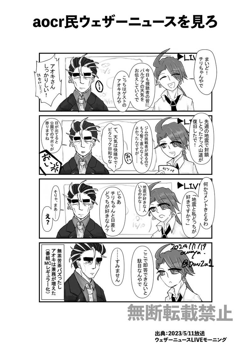 天野さぎり☆quiet followDONE友人からウェ〇ーニュースがaocrというタレコミを受けて見たら想像以上にジェネリックaocrで発狂したのでTLの皆様にも共有しなければならないという漫画。話の帳尻合わせるために色々改変してる。 Tap to full screen (size:1290x1822).Repost is prohibited Let's send reactions! freqpopularsnackothersPayment processing Replies from the creator Follow creator you care about!☆quiet follow 天野さぎりDOODLEアロハオキぱないというらくがき。雑すぎる。原稿もどる。 天野さぎりDOODLEトシカイ解体した落書き置き場。順次追加される予定。今んとこネタバレないけどそのうちネタバレ絵置きそうなのでパス付き。 2 天野さぎりPROGRESSブックカバーを多色刷りにしようとイメージ描いてるけどさっぱりわからん。 天野さぎりDONE新刊表紙のチちゃんの顔なんかしっくりこなくて三度目の整形した。デザインも色々変えた。もうこれで決定する。 天野さぎりDOODLE🍙を手癖で描きすぎているので練習。うーん人体苦手だ。 天野さぎりDOODLEお中元で挿絵没った代わりに差し替えた絵。手癖で書くとこうなってまう。 recommended works Indigo030DOODLE 5 奈影_PROGRESS 3 🔥🔥🔥🔥TRAININGエースくん練習しても光彦になってしまう·····2枚目はラクガキ 2 Indigo030DOODLE漫画に説明不足ですみません、とりあえず桔平とさくらがイチャイチャを描きたかったです。 7 UKLOVEGOOD1PROGRESS進捗ー 2 fuji_121DOODLE一昨日のかなベリアルくん 2 ハイパー鰻サイクロンDOODLE前に描いたクチグズ Noll919PROGRESS てぎあDOODLEアイナちゃんアナログらくがき