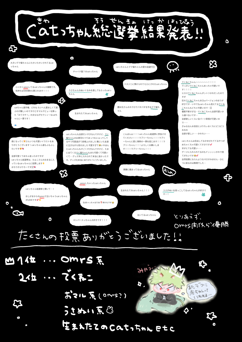kimininatteku☆quiet followDOODLEcatっちゃん総選挙大会の結果発表です。投票ありがとうございました! show all(+16 images) Tap to full screen (size:2894x4093).Repost is prohibited Let's send reactions! freqpopularsnackothersPayment processing Replies from the creator Follow creator you care about!☆quiet follow kimininattekuMENUきゃちきゃち飯店の暫定メニュ〜です。何事もなければ9/10(きゅ〜との日)の22時にBOOTHに在庫をいれると思います。【追記】・八卦バッジの頒布価格変更しました。・大盛りセットをメニューに追加しました。 3 kimininattekuMAIKINGcatっちゃんとデお兄さんが出会う話の前編に後編追加しました。ポイピク内のcatっちゃんのうさぬいのひみつというお話と繋がってます。 20 kimininattekuPROGRESS色がつくかもしれないしつかないかもしれないって感じのcatっちゃんだ! 2 kimininattekuDOODLEՇ゛く猫とかっぱいとcatっちゃんTwitterに載せてたやつとラフとおまけです。 4 kimininattekuDONEcatっちゃんラジオのラジオ原稿です。文字ばかりで見づらくて申し訳ありません。※絵はなくテキストのみです。 30 kimininattekuDOODLEかわいそかわいい目指したにゃんたまらくがき◌◌🥢omrs注意 3 recommended works Nekomi_0DOODLE 節約したいよ清原DOODLE体調不良キミトスらくがき元気元気おちゃらけ優お兄さんに体調不良が刺さりすぎた魂の方は本当に休んで欲しいですごめんなさい 3 雨霁935MOURNINGスヤ→あく 無理矢理🔞あく→スヤ後であるかも18↑?(yes/no) 2 oyatsuboxopenDOODLE赤ずきんパロ?退スグ・狼×赤ずきんぽいけどその要素はあんまりない・ケモ耳退部届くんとカボチャパンツぽいやつ穿いたスグリくんが描きたかった いっぬPROGRESSパス固定ツイ 8 noyatabetaiDOODLE他界隈落描きサマーウォーズ/東リベ/ダンロン/呪術/鬼滅/殺天/Ib/コナン/ブルロほんとにしょーもないし1枚2枚の落描きです大丈夫な方→yes/no 14 SuiZhaorDOODLE被掌控?⚠️无码🔑:🍎的身高生日 2 UsikiyamaPROGRESS6月のイベントに持っていきたい新しいグッズこんな感じの作りたいかも〜アヒル🐥⸒⸒はウチの趣味。 YonohitomiDONE 2