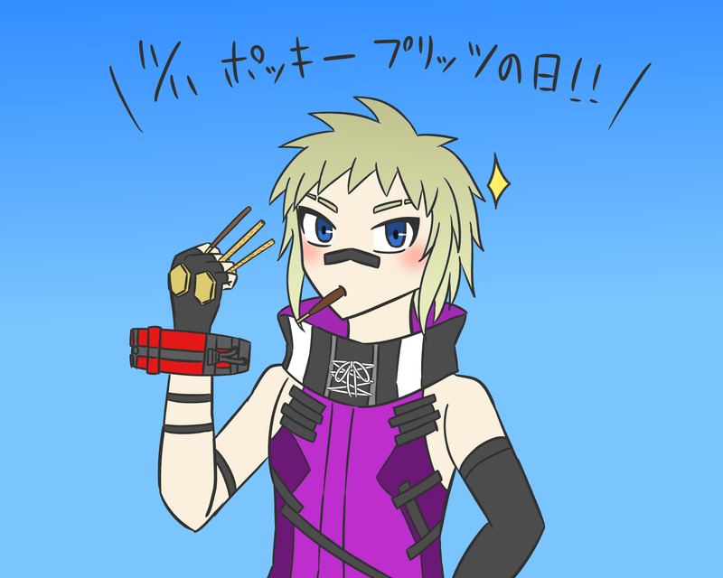〔GE3〕遥か昔に描いたポッキー&プリッツの日のジーク。持ってるのがポッキー、プリッツ、トッポで、食べているのがフランだった気がする。