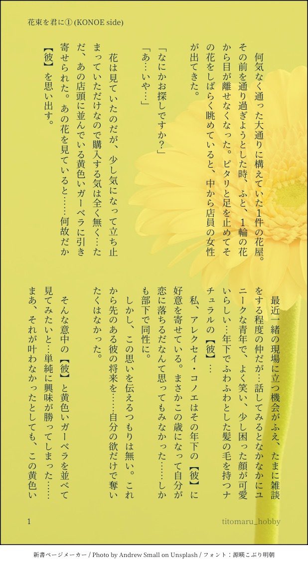 titomaru_千兎。☆quiet followPAST花束を君に(コノチャ)以前X(旧Twitter)であげていた、コノさんとチャさんが花束を送り合う話を一括で読めるようにまとめたものです。和香さん(@waka_TOV)の素敵な設定をお借りしております。https://x.com/waka_TOV/status/1812873265435840685X投稿日 2024年7月20日2024年7月24日2024年7月30日 #コノチャ show all(+21 images) Tap to full screen (size:618x1132).Repost is prohibited Let's send reactions! freqpopularsnackothersPayment processing Replies from the creator Follow creator you care about!☆quiet follow titomaru_千兎。DOODLECEのどこかでモルゲンレーテ社仕様のチャさんがいたかもしれない。2枚は差分。たばこみゅにけーしょんがあったかもしれない(癖) 2 titomaru_千兎。DOODLE先日描いたチャバニーボーイさん。https://poipiku.com/1311792/12167195.html着たのなら脱いだところもみたいんだなぁ……(煩悩)お相手はあなたの心の中に問うてみてもろてぇ……※差分が一枚入ってますお肌見えてますので🗝付案件チャ誕(四桁) 2 titomaru_千兎。DOODLE最近お見掛けしたチャバニーボーイが刺さって刺さってぇ~~酔っぱらいのラクガキ(っ'-' )╮三そーい!! titomaru_千兎。DOODLE彼軍服。しゅけべな絵ってむずかしいね……ちとお。(コノチャ匂わせ)はだけているので🗝付き案件コノ年齢+チャ誕(6桁) titomaru_千兎。DOODLE8月2日はバニーの日!!と、言うことでせくしー(当社比)な🐰チャさん。(🐰パロと以前描いた🐰耳チャさんを少し手直ししたもの) 2 titomaru_千兎。DOODLE【種×pk落書き】チャさんには電気タイプを、コノさんにはノーマルタイプを持たせたい。 2 related works 桜凪_sanaPASTうか(@uka_rkk)さんの設定をお借りしました!コノチャ♀です。2024/07/11 X投稿2024/07/12 加筆修正・pixiv投稿 8 あお(すっぱいまんはうまい)DOODLE「聞き巧者と勘者の秘め事」の後日談その2です。pixivのオマケなので読まなくとも支障ございません。今回は2パターン作りました。※こちらはハッピーエンドバージョンです。🔑はチャンドラの誕生日(4文字) 1486 桜凪_sanaPASTコノチャ♀。わたしは、こう……チャにやられて(やられて?)慌てふためいて動揺する艦長を見たいんだな……きっと。何回でも見たい。2024/07/27 X投稿 titomaru_千兎。PAST今日も月は綺麗です(現パロ/コノチャ)和香さん(@waka_TOV )の素敵な設定お借り致しました。https://x.com/waka_TOV/status/1829416411988721704舞台設定が冬場という事でしたのでコノさんにおめかししてもらいました。X投稿日 2024年9月1日 3 titomaru_千兎。PAST花束を君に(コノチャ)以前X(旧Twitter)であげていた、コノさんとチャさんが花束を送り合う話を一括で読めるようにまとめたものです。和香さん(@waka_TOV)の素敵な設定をお借りしております。https://x.com/waka_TOV/status/1812873265435840685X投稿日 2024年7月20日2024年7月24日2024年7月30日 22 桜凪_sanaPASTコノチャ。コノの爪をチャが手入れする話。両片思い。2024/08/11 X投稿2024/08/11 加筆修正・pixiv投稿 9 あお(すっぱいまんはうまい)DOODLE「聞き巧者と勘者の秘め事」の後日談です。pixivのオマケなので読まなくとも支障ございません。今回は2パターン作りました。※こちらはバッドエンドバージョンです。バッドエンド苦手な方はご注意ください。直接描写はありませんが人がお亡くなりになります。🔑はチャンドラの誕生日(4文字) 1260 桜凪_sanaPASTコノチャで身長差のあるキス。昨日放送の○に翼、に触発されて、勢いで生まれたもの。あの雰囲気は文章に落とし込めず……ただの身長差キスの話になっちゃった。2024/08/10 X投稿2024/08/14 加筆修正・pixiv投稿 3 桜凪_sanaPASTコノチャ。ハロのイタズラの結果です。2024/08/18 X投稿2024/09/02 加筆修正・pixiv投稿 5 recommended works こいとDOODLE過去絵今でもお気に入りだったりする。#Fate #FGO #セミラミス #シャーペン #アナログ 落書きしかないなえもTMP-SAVEアナログ色がなくて挫折し、デジタルにカキナオシテマス(挫折しかけ) #FGO とみしばDONE #FGO #ネロできました。 黄DOODLE( ᐛ👐) パァ 3 しらすDOODLEコミカライズの英霊剣豪やばいよねって思って武蔵ちゃん練習してます。 2 カナリアTRAININGモーちゃんの鎧かっこいい好き。でもどうなってんのかわからん。いつか資料なしで描けるようになりたいなあどうでもいいけどペンの裏写りがすごい いつきDONEひさびさにコッチにも載せておこう。 しらすDOODLE沖田さん ano1536980141DONE 3