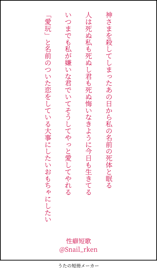 Snail_rken☆こそフォロ過去のを晒す2025/10/31 タップで全画面(原寸:550x950)無断転載禁止 リアクションをたくさん送って応援しよう! よく使う人気おやつその他支払処理中 作者からのリプライ 気になる人をどんどんフォローしよう!☆こそフォロ Snail_rkenネタバレわなびHO2-蜜屋林檎エンド罠!!わなわな!! 2627 Snail_rkenネタバレいわひら、蝸牛が生成するファム・ファタール教祖様だったらこんな感じになるかな妄想性癖のファム・ファタールはサロメと桜の森の満開の下です 2454 Snail_rkenらくがきバレンタインのわなびHO2と友情出演らんまHO1 3508 Snail_rkenネタバレ春木シンヤ-いわひら信者最後まで悪人でしかなかった人 3289 Snail_rkenらくがき2026/2/4 2 Snail_rkenらくがき2026/2/4