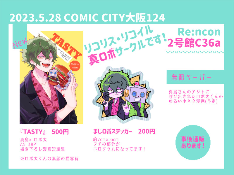hasuno☆quiet followMENU2023.5.28 COMIC CITY大阪124【2号館C36a】真ロボでサークル参加してます画像2枚目から新刊サンプルとステッカー実物と当日のポスターのイラストです。よろしくお願いします※投稿エラーで再送繰り返してたら連投になってました😭すみません😭😭 ##リコリコ show all(+10 images) Tap to full screen (size:2048x1536).Repost is prohibited Let's send reactions! freqpopularsnackothersPayment processing Replies from the creator Follow creator you care about!☆quiet follow hasunoINFOインテで配布した真ロボの無配でした。スペースお立ち寄りくださった皆様ありがとうございました🙏【BOOTH通販開始しました】▼真ロボ新刊https://rencon08.booth.pm/items/4812961 ▼ステッカーhttps://rencon08.booth.pm/items/4813031 3 hasunoMENU2023.5.28 COMIC CITY大阪124【2号館C36a】真ロボでサークル参加してます画像2枚目から新刊サンプルとステッカー実物と当日のポスターのイラストです。よろしくお願いします※投稿エラーで再送繰り返してたら連投になってました😭すみません😭😭 11 hasunoMOURNINGDAオペレーターロボ太くん概念ふわっと頭の中にあるif設定(2枚目追加しました)まじロボ前提⚠️🤖顔有 2 hasunoDOODLE⚠️素顔🤖くんまじロボ2枚目事後感あるので注意 2 hasunoSPUR ME5/28のCOMIC CITY大阪にまじロボで申し込んでます。進捗ヤバめです。でも出します。 5 hasunoDOODLEちさたき、かばちさ、千束(若干血注意) 3 recommended works hasunoDONEゾンビナースもりくぼ #森久保乃々 #アイドルマスターシンデレラガールズ hasunoDOODLEデ hasunoPAST hasunoDOODLEエターナル 2 hitodeo0PAST2015年に初めて同人誌出してからまんがを描けるようになることを目標に生きてきたけどだいぶ成長した hitodeo0DONEデン!2019進化録のやつ~!今年は前半はいい感じの一枚絵いっぱい描いてたな 後半は漫画を描いていました hitodeo0DOODLEタガツォさんデザの海星さん! hasunoDOODLE逆バニーに抗うロシキノ 7 hasunoMOURNINGdecoy