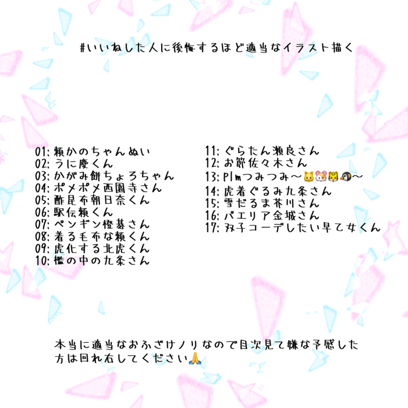 🐱🐰♡🐧🐧☆quiet followDOODLE # いいねした人に後悔するほど適当なイラスト描く2022年新年早々にタグ遊び!何でも許せる方だけ見てね^._.^ ##タグ遊び ##捧物 show all(+17 images) Tap to full screen (size:1000x1000).Repost is prohibited Let's send reactions! freqpopularsnackothersPayment processing Replies from the creator Follow creator you care about!☆quiet follow 🐱🐰♡🐧🐧PASTpart.6カプログまとめ🐱🐰🐧🐧🐈⬛⚠️日常、イベネタ有り⚠️男女逆転有り 32 🐱🐰♡🐧🐧DONE今さら感あるけど💋💄🐱🐰ネタ! 3 🐱🐰♡🐧🐧DONE⟡.·*.··············································⟡.·*. 2020.05.04 ➤➤➤ 2025.05.04 ♡ 5th Anniversary ♡⟡.·*.··············································⟡.·*. 🐱🐰♡🐧🐧DOODLE2025年エイプリルフール!(ポフン)(`・ω・´)<使い魔2号異世界で出逢ったイケメンと恋に落ちるイベにて魔王ケイに使えていた使い魔さん※使い魔さんは捏造です2021年にも使い魔さんで遊んだよ!→ https://poipiku.com/1325549/4125677.html 5 🐱🐰♡🐧🐧PAST5.ログまとめ落書き多めです⚠️企画ネタ、ホムコメネタ有り⚠️女装有り 35 🐱🐰♡🐧🐧DONE2025.03.03𝐇𝐚𝐩𝐩𝐲 𝐁𝐢𝐫𝐭𝐡𝐝𝐚𝐲.⋆𝜗𝜚.*慶くんお誕生日おめでとう〜!⚠︎︎最後にうちカプrkgk有り 3 recommended works コソバ ユイ。MAIKINGちょっとしたif世界。どれが誰かな。 もぅこはんDONEプラスメイト 瀬良奏 本を読みながら待ち伏せしてほしい妄想絵色変えてみたりなんやらかんやら…#PLASMATE#瀬良奏 2 kurou_mhDONE【2022年7月お絵描きLog】※お誕生日イラストは別途アップしてます 4 みどりさわTRAINING5作目難しかった~💦このふたりがそんな短時間だけ会うシチュエーションってどんな?!ってなりながら、何とか書きました💦 337 と、、んは。ちDONEまなんちょWebオンリー開催おめでとうございます❣️不安なのでこちらでもピクスペと同じものを展示してます。ネップリも。見やすい方で見ていただけたらうれしいです。 7 leleRageDOODLE随分昔の供養完成してない(するつもりもない)けど見る?yes/no 3 南無…DOODLE潔黒ベリー好き黒名可愛すぎてたまらんです一途で健気で包容力のある年下最高もう少し細身で小柄で描きたいけど手癖に負けてるいさくろとかiskrとか表記あるけどどれがベタなのかな 7 あおいしょうPROGRESS桐生ちゃん、ちょっと目を細めた方が桐生ちゃんに見えるような気がする…? Le34_yDONE法廷物理ガチバトル