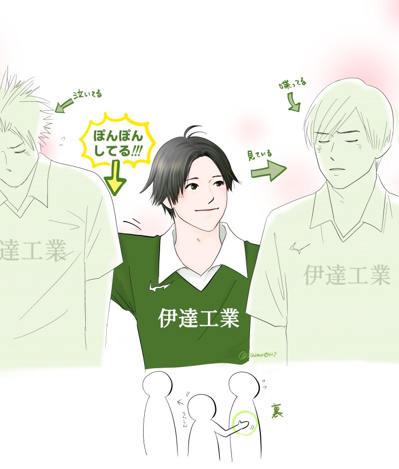 目線は話している人から動かすことなく、反対側の仲間の背中にスッと手を回しぽんぽんしたのを見て萌えのあまり枕に突っ伏して叫んだ