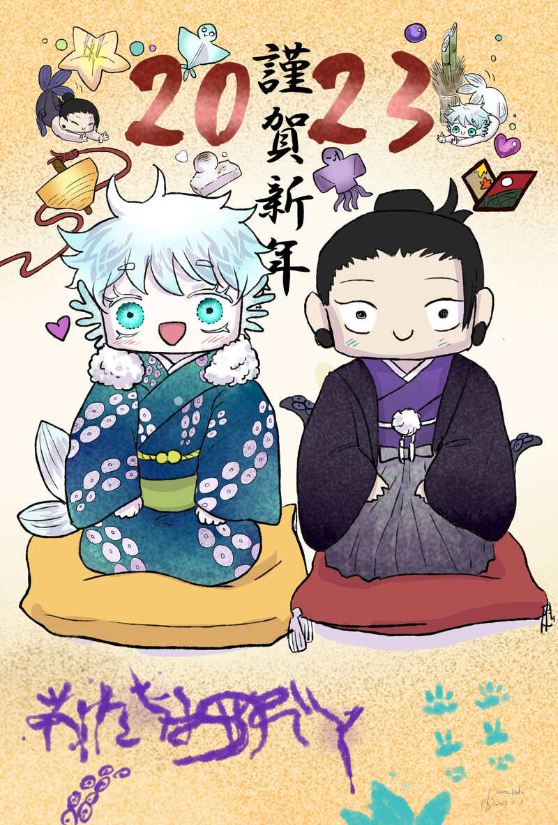 あけましておめでとうございます!🐙と🧜♂️からの御年賀を展示とネットプリントで公開させていただきます。葉書サイズで印刷できるかと思います✌