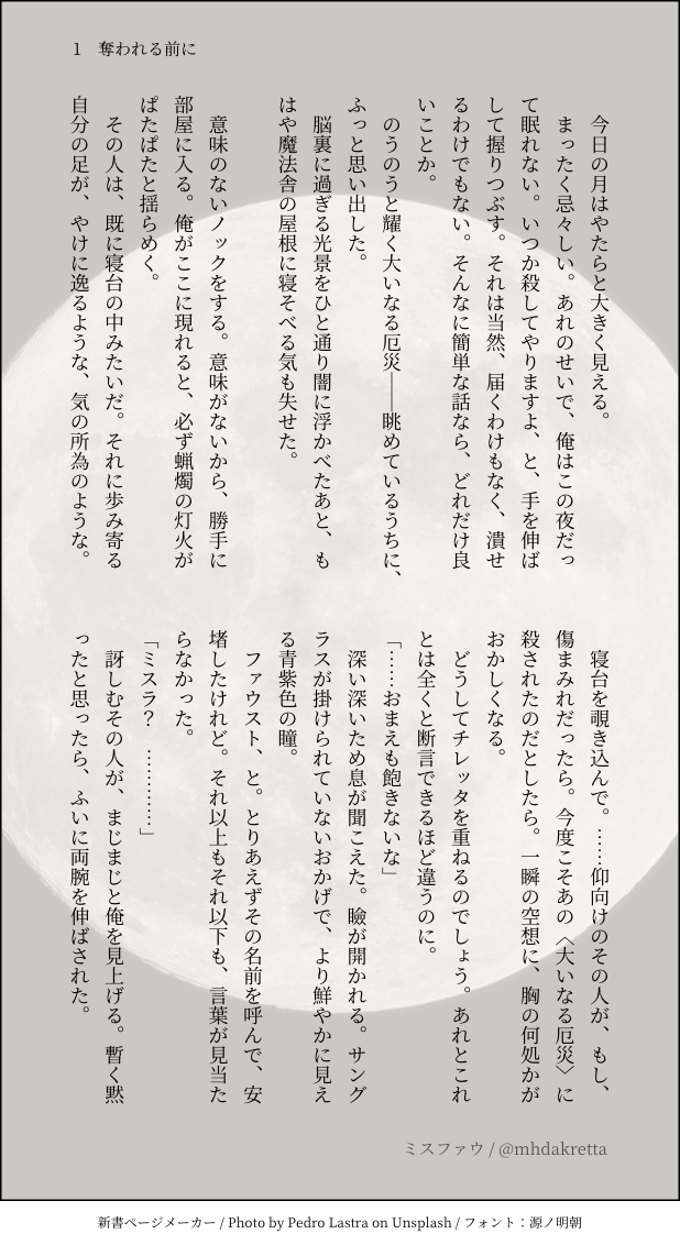 れた☆quiet followDONE【ミスファウ】お月様ボイスのお話『奪われる前に』 #ミスファウ misfau show all(+1 images) Tap to full screen (size:618x1132).Repost is prohibited Let's send reactions! freqpopularsnackothersPayment processing Replies from the creator Follow creator you care about!☆quiet follow れたDONEミスファウSSのハイライトまとめです💀🪞💜💙✨◆素敵なメーカー:装丁カフェ 様◆一枚目Pixivフリー素材をお借りしております。ありがとうございます! 15 れたDONE【ミスファウ】『ぬくもり』◆サイト:https://plus.fm-p.jp/u/aconiuzu/book/page?id=4&bid=25 2 れたDONE【ミスファウ】『のろけばなし』要するに愛しい恋人の話。そんなミスファウ、ファさんSSです🔖◆サイトおまけあります💓:https://plus.fm-p.jp/u/aconiuzu/book/page?id=3&bid=25 2 れたDONE【ミスファウ:June bride】『愛しの戯れ』結婚してるミスファウとハロウィン仮装衣装のSS🎃💕サイト:https://plus.fm-p.jp/u/aconiuzu/book/page?id=27&bid=20 4 れたDONEミスファウSSまとめです。 29 れたDONE【ミスファウ/ネモフィラは咲く】おめでとうAnniversary 3 related works きいろDOODLEしばらくこのままで。 れたDONE【ミスファウ:June bride】ミススポットからSSです。ミスファウ結婚してます『死の湖の渡し守』 4 きいろCAN’T MAKEミスファウちゃん... れたINFO50文字ミスファウ10話まとめ 10 れたSPOILER【ミスファウ】ミス印象ネタ含みます。ネタバレご注意。『ひとつになる影』 2 れたDONE六月花嫁(June bride)ミスファウリクエスト頂いた『人間と魔法使いの双子を育てる話』の前編です。 4 れたDONE【ミスファウ】『付き合っていられない』……といいつつ。 2 れたDONE六月花嫁ミスファウ話。かけがえない居場所 2 akauni8DONEこの前の妖異譚の続き的なやつです!だいぶ懐いた子天狗ファに久しぶりにあったら呼び捨てにされたことに、ちょっとムスっとしてる竜ミです!(服は適当) 2 recommended works れたSPOILER【ミスファウ】ミス印象ネタ含みます。ネタバレご注意。『ひとつになる影』 2 れたDOODLE【ミスファウ】『フラッシュバック・キャットシャドウ』 4 れたDOODLEミスファウ『少しの願い』 2 れたDONE【ミスファウ】『トリックアンドトリック』飴ちゃんひとつふたつ🍬🍬 4 れたDONE【ミスファウ】『Happy Halloween Veil』最高のハロウィンをふたりで。 4 れたDONE【ミスファウ:June bride】『寝つけない夜に』 3 れたDONE【ミスファウ】よきおちり 3 れたDONE【ミスファウ:June bride】昔と今。 2 れたDONE【ミスファウ】強がる方の負け 6
