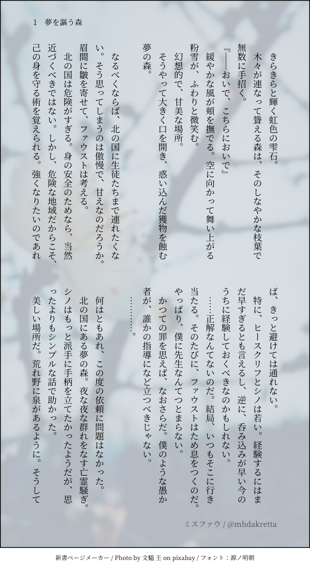れた☆quiet followDONE【ミスファウ】『夢を謳う森』リクエストありがとうございます🍀 #ミスファウ misfau show all(+4 images) Tap to full screen (size:618x1132).Repost is prohibited Let's send reactions! freqpopularsnackothersPayment processing Replies from the creator Follow creator you care about!☆quiet follow れたDONEミスファウSSのハイライトまとめです💀🪞💜💙✨◆素敵なメーカー:装丁カフェ 様◆一枚目Pixivフリー素材をお借りしております。ありがとうございます! 15 れたDONE【ミスファウ】『ぬくもり』◆サイト:https://plus.fm-p.jp/u/aconiuzu/book/page?id=4&bid=25 2 れたDONE【ミスファウ】『のろけばなし』要するに愛しい恋人の話。そんなミスファウ、ファさんSSです🔖◆サイトおまけあります💓:https://plus.fm-p.jp/u/aconiuzu/book/page?id=3&bid=25 2 れたDONE【ミスファウ:June bride】『愛しの戯れ』結婚してるミスファウとハロウィン仮装衣装のSS🎃💕サイト:https://plus.fm-p.jp/u/aconiuzu/book/page?id=27&bid=20 4 れたDONEミスファウSSまとめです。 29 れたDONE【ミスファウ/ネモフィラは咲く】おめでとうAnniversary 3 related works きいろCAN’T MAKEミスファウちゃん... れたDONE【ミスファウ】『付き合っていられない』……といいつつ。 2 れたDONE【ミスファウ:June bride】ミススポットからSSです。ミスファウ結婚してます『死の湖の渡し守』 4 きいろDOODLEしばらくこのままで。 れたDONE六月花嫁(June bride)ミスファウリクエスト頂いた『人間と魔法使いの双子を育てる話』の前編です。 4 れたSPOILER【ミスファウ】ミス印象ネタ含みます。ネタバレご注意。『ひとつになる影』 2 れたINFO50文字ミスファウ10話まとめ 10 akauni8DONEこの前の妖異譚の続き的なやつです!だいぶ懐いた子天狗ファに久しぶりにあったら呼び捨てにされたことに、ちょっとムスっとしてる竜ミです!(服は適当) 2 れたDONE六月花嫁ミスファウ話。かけがえない居場所 2 recommended works きいろCAN’T MAKEミスファウちゃん... れたINFO50文字ミスファウ10話まとめ 10 れたSPOILER【ミスファウ】ミス印象ネタ含みます。ネタバレご注意。『ひとつになる影』 2 れたDONEミスファウ/Hello Halloween 4 れたDONEカボチャのキッシュ/ミスファウ賢者様とセルフなカボチャとミスファウ 5 れたDONE【ミスファウ:June bride】『金赤眼色の訪問者』結婚してるミスファウと北の国のお友達(?) 4 れたDONE【現パロ:ミスファウ】『二人おなじ帰り路』現代パロ、ミス×病弱ファさん。つきあってます。ハッピーハロウィン🎃 4 れたDONE【ミスファウ】『赤い糸』 3 れたDONE【ミスファウ】『ちいさな手』リクエストありがとうございます!ショタ化ファです。 4