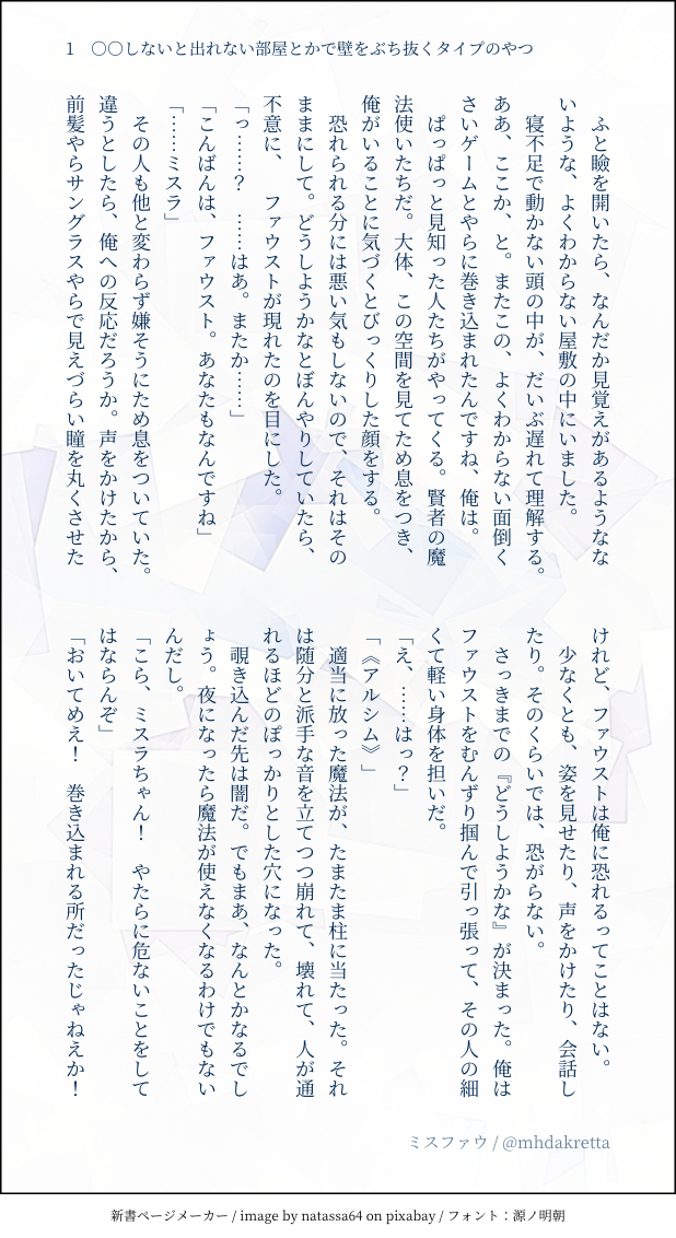 れた☆quiet followDONE【ミスファウ/ぶち抜くタイプ】 #ミスファウ misfau show all(+1 images) Tap to full screen (size:618x1132).Repost is prohibited Let's send reactions! freqpopularsnackothersPayment processing Replies from the creator Follow creator you care about!☆quiet follow れたDONEミスファウSSのハイライトまとめです💀🪞💜💙✨◆素敵なメーカー:装丁カフェ 様◆一枚目Pixivフリー素材をお借りしております。ありがとうございます! 15 れたDONE【ミスファウ】『ぬくもり』◆サイト:https://plus.fm-p.jp/u/aconiuzu/book/page?id=4&bid=25 2 れたDONE【ミスファウ】『のろけばなし』要するに愛しい恋人の話。そんなミスファウ、ファさんSSです🔖◆サイトおまけあります💓:https://plus.fm-p.jp/u/aconiuzu/book/page?id=3&bid=25 2 れたDONE【ミスファウ:June bride】『愛しの戯れ』結婚してるミスファウとハロウィン仮装衣装のSS🎃💕サイト:https://plus.fm-p.jp/u/aconiuzu/book/page?id=27&bid=20 4 れたDONEミスファウSSまとめです。 29 れたDONE【ミスファウ/ネモフィラは咲く】おめでとうAnniversary 3 related works れたDONE【ミスファウ:June bride】ミススポットからSSです。ミスファウ結婚してます『死の湖の渡し守』 4 れたSPOILER【ミスファウ】ミス印象ネタ含みます。ネタバレご注意。『ひとつになる影』 2 きいろDOODLEしばらくこのままで。 akauni8DONEこの前の妖異譚の続き的なやつです!だいぶ懐いた子天狗ファに久しぶりにあったら呼び捨てにされたことに、ちょっとムスっとしてる竜ミです!(服は適当) 2 れたINFO50文字ミスファウ10話まとめ 10 れたDONE六月花嫁ミスファウ話。かけがえない居場所 2 れたDONE【ミスファウ】『付き合っていられない』……といいつつ。 2 れたDONE六月花嫁(June bride)ミスファウリクエスト頂いた『人間と魔法使いの双子を育てる話』の前編です。 4 きいろCAN’T MAKEミスファウちゃん... recommended works きいろCAN’T MAKEミスファウちゃん... れたDONE六月花嫁ミスファウ話。かけがえない居場所 2 れたDONE【ミスファウ:June bride】『金赤眼色の訪問者』結婚してるミスファウと北の国のお友達(?) 4 れたDONE【ミスファウ】お月様ボイスのお話『奪われる前に』 2 れたDONE【ミスファウ:June bride】『とびっきりのお菓子』 4 れたDONE【ミスファウ:June bride】『寝つけない夜に』 3 きいろDOODLE両手で持って飲みたいけど、手が繋がれたままでちょっと困るファ れたDONE【ミスファウ】ミスファウとネロさん 4 れたDONE【ミスファウ】強がる方の負け 6