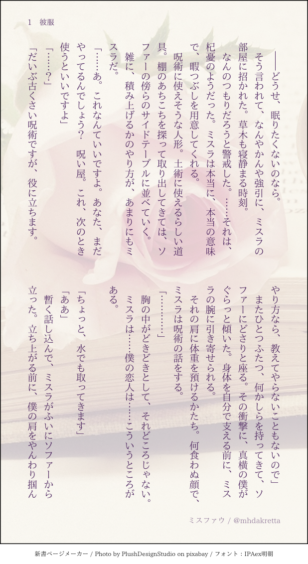 れた☆quiet followDONE【ミスファウ】彼シャツ彼服 #ミスファウ misfau show all(+4 images) Tap to full screen (size:618x1132).Repost is prohibited Let's send reactions! freqpopularsnackothersPayment processing Replies from the creator Follow creator you care about!☆quiet follow れたDONEミスファウSSのハイライトまとめです💀🪞💜💙✨◆素敵なメーカー:装丁カフェ 様◆一枚目Pixivフリー素材をお借りしております。ありがとうございます! 15 れたDONE【ミスファウ】『ぬくもり』◆サイト:https://plus.fm-p.jp/u/aconiuzu/book/page?id=4&bid=25 2 れたDONE【ミスファウ】『のろけばなし』要するに愛しい恋人の話。そんなミスファウ、ファさんSSです🔖◆サイトおまけあります💓:https://plus.fm-p.jp/u/aconiuzu/book/page?id=3&bid=25 2 れたDONE【ミスファウ:June bride】『愛しの戯れ』結婚してるミスファウとハロウィン仮装衣装のSS🎃💕サイト:https://plus.fm-p.jp/u/aconiuzu/book/page?id=27&bid=20 4 れたDONEミスファウSSまとめです。 29 れたDONE【ミスファウ/ネモフィラは咲く】おめでとうAnniversary 3 related works きいろCAN’T MAKEミスファウちゃん... きいろDOODLEしばらくこのままで。 れたSPOILER【ミスファウ】ミス印象ネタ含みます。ネタバレご注意。『ひとつになる影』 2 れたDONE【ミスファウ】『付き合っていられない』……といいつつ。 2 れたDONE六月花嫁(June bride)ミスファウリクエスト頂いた『人間と魔法使いの双子を育てる話』の前編です。 4 akauni8DONEこの前の妖異譚の続き的なやつです!だいぶ懐いた子天狗ファに久しぶりにあったら呼び捨てにされたことに、ちょっとムスっとしてる竜ミです!(服は適当) 2 れたDONE【ミスファウ:June bride】ミススポットからSSです。ミスファウ結婚してます『死の湖の渡し守』 4 れたDONE六月花嫁ミスファウ話。かけがえない居場所 2 れたINFO50文字ミスファウ10話まとめ 10