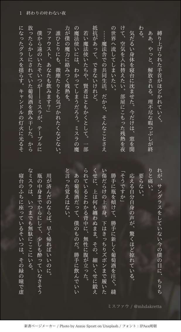 れた☆quiet followDONE【R15/ミスファウ】お揃い #ミスファウ misfau show all(+3 images) Tap to full screen (size:618x1132).Repost is prohibited Let's send reactions! freqpopularsnackothersPayment processing Replies from the creator Follow creator you care about!☆quiet follow れたDONEミスファウSSのハイライトまとめです💀🪞💜💙✨◆素敵なメーカー:装丁カフェ 様◆一枚目Pixivフリー素材をお借りしております。ありがとうございます! 15 れたDONE【ミスファウ】『ぬくもり』◆サイト:https://plus.fm-p.jp/u/aconiuzu/book/page?id=4&bid=25 2 れたDONE【ミスファウ】『のろけばなし』要するに愛しい恋人の話。そんなミスファウ、ファさんSSです🔖◆サイトおまけあります💓:https://plus.fm-p.jp/u/aconiuzu/book/page?id=3&bid=25 2 れたDONE【ミスファウ:June bride】『愛しの戯れ』結婚してるミスファウとハロウィン仮装衣装のSS🎃💕サイト:https://plus.fm-p.jp/u/aconiuzu/book/page?id=27&bid=20 4 れたDONEミスファウSSまとめです。 29 れたDONE【ミスファウ/ネモフィラは咲く】おめでとうAnniversary 3 related works れたSPOILER【ミスファウ】ミス印象ネタ含みます。ネタバレご注意。『ひとつになる影』 2 れたDONE六月花嫁ミスファウ話。かけがえない居場所 2 れたINFO50文字ミスファウ10話まとめ 10 きいろCAN’T MAKEミスファウちゃん... れたDONE【ミスファウ:June bride】ミススポットからSSです。ミスファウ結婚してます『死の湖の渡し守』 4 れたDONE【ミスファウ】『付き合っていられない』……といいつつ。 2 れたDONE六月花嫁(June bride)ミスファウリクエスト頂いた『人間と魔法使いの双子を育てる話』の前編です。 4 akauni8DONEこの前の妖異譚の続き的なやつです!だいぶ懐いた子天狗ファに久しぶりにあったら呼び捨てにされたことに、ちょっとムスっとしてる竜ミです!(服は適当) 2 きいろDOODLEしばらくこのままで。 recommended works きいろCAN’T MAKEミスファウちゃん... れたDONEミスファウ、新規SSR衣装ネタです。 2 れたDOODLE【ミスファウ】『フラッシュバック・キャットシャドウ』 4 れたTRAININGハッピーハロウィンミスファウ 4 れたDONEミスファウ/Hello Halloween 4 れたDONE【ミスファウ】『トリックアンドトリック』飴ちゃんひとつふたつ🍬🍬 4 れたDONE【ミスファウ】『Happy Halloween Veil』最高のハロウィンをふたりで。 4 れたDONE【ミスファウ】『ちいさな手』リクエストありがとうございます!ショタ化ファです。 4 れたDONE50文字ミスファウまとめ 11から22 11