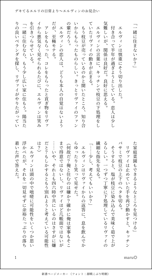 maru◎☆quiet followPAST既刊『デキてるエルリの日常』より、エルヴィンのお見合い話。エルヴィン→弁護士、リヴァイ→ジムのトレーナーという現パロエルリ(付き合ってる)の日常を書いて集めた本でした。一章分を掲載します。 show all(+17 images) Tap to full screen (size:618x1132).Repost is prohibited Let's send reactions! freqpopularsnackothersPayment processing Replies from the creator Follow creator you care about!☆quiet follow maru◎DONE選ばれし花婿(十)。不定期連載、捏造オメガバースエルリ。出て行ってしまったリバイを連れ戻して良いものかエルビンは悩んでいた。そんなエルビンの元に、黒髪の少女がやってくる。前の話(九)→https://poipiku.com/1354981/9366722.html 4 maru◎DONE選ばれし花婿(九)。不定期連載、捏造オメガバースエルリ9話目。ジークとの件があってから、リバイに対して過保護すぎるほど過保護になってしまっているエルビンだが……?前の話(八)→https://poipiku.com/1354981/9357113.html 4 maru◎DONE選ばれし花婿(八)。不定期連載、捏造オメガバースエルリ8話目。ジークとリバイの話、リバイのターン。少しだけエルビンとのリバイの関係が進展……?前の話(七)→https://poipiku.com/1354981/9352557.html 7 maru◎DONE選ばれし花婿(七)。不定期連載中、捏造オメガバースエルリ。他国から、ジークという名の男がエルヴィンと仕事がしたいとやってくる話。前の話(六)→https://poipiku.com/1354981/9349077.html 4 maru◎DONE選ばれし花婿(六)。不定期連載、捏造オメガバースエルリ。商談にアカマンの名を使っていいとリバイに言われたエルビン、使ってみると驚くほど効果があって…?という話。前の話(五)→https://poipiku.com/1354981/9349065.html 3 maru◎DONE選ばれし花婿(五)不定期連載中。捏造オメガバースエルリ。結婚して、少しだけ懐いてきた?リバイの話。四話→https://poipiku.com/1354981/9325083.html 8 recommended works akanekokinokoDONEあけましておめでとうございます!な姫はじめネタ。卯年なのをいいことにバニーちゃん、とか阿呆なこと考えた結果、服が変な方向にぶっ飛んでいきました。ごめんなさい。皆様にとって良い1年になりますように! 4 Ricca1242150DONEスミ先の水着姿に挙動不審になるりばい先生❤︎両片思い、できてない体化。りばい先生が変な人です。エルリが楽しく過ごしてるなら細かいこと気にしないよ!という方向けです。 4 ごにょにょDONEお互いにいっぱい跡を残しちゃうの好き🥰※事後すっぽんぽん注意 choccy-milkyDONEseb & clora partaking in the very wholesome act of starting their family 😇 (celeste cameo!!) 2 ほいほいPASTオタワス、パスは18以上か?支部であげてる小咄です。 8935 あきむDONE線画/鉛筆ペン3ミリ色塗り/色鉛筆キャンバス/布地(アイビス)で描いてみた。 キナコDOODLESkebでご依頼いただいてるキャラのラフです。ミドリガメのタウル(戦士…格闘家イメージです)くんと兎獣人(ヒーラー)ちゃん♪ 3 sora_switch_3DOODLE脳内バグ起きてる※力尽きて衣装適当ですごめんなさい😿 あーにゃんDOODLE