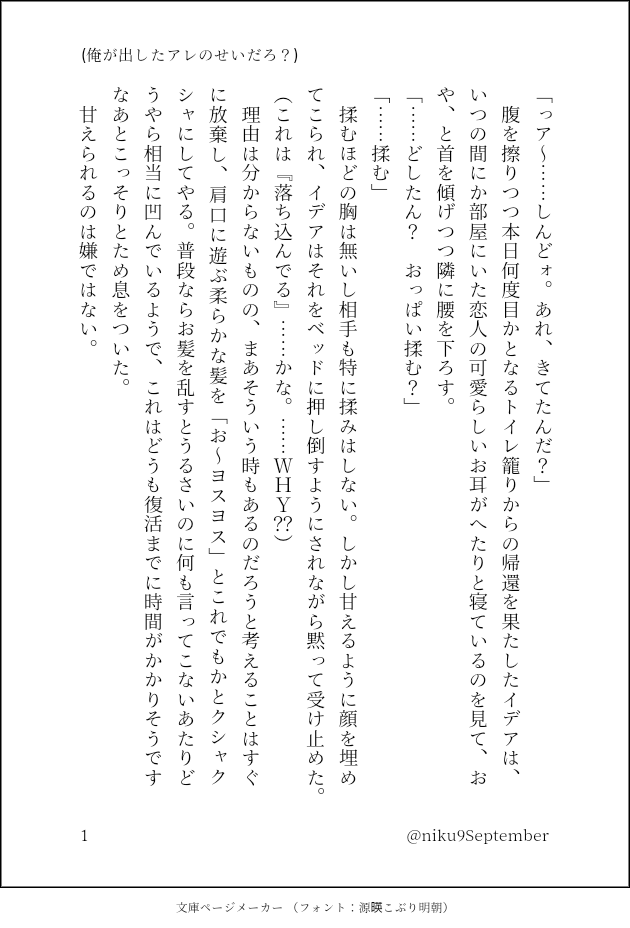 niku9September☆quiet followDOODLE腹痛の原因は…レオイデレオナ落ち込みの理由はタイトル参照 #レオイデ leoide show all(+1 images) Tap to full screen (size:630x928).Repost is prohibited Let's send reactions! freqpopularsnackothersPayment processing Replies from the creator Follow creator you care about!☆quiet follow niku9SeptemberDONEレオナとレオナ♀とイデアの(レオ+レオ♀)×イデな3P。R18。イデアだけが右、レオレオ♀も距離感バグっているかもしれませんが互いに認識は「自分」なので他意はなく実質自慰です。パスは共通。いつかちゃんと完成させたい…といいながら前回からほぼ進捗0です 8554 niku9SeptemberDOODLE腹痛の原因は…レオイデレオナ落ち込みの理由はタイトル参照 2 niku9SeptemberDOODLEレオ→イデ君にしか使えない魔法的な 2 niku9SeptemberDOODLEついすてラクガキいろいろ 2 niku9SeptemberDOODLE春のレデ(春っぽくはない) niku9SeptemberDONEモブランドの展示作品主任×所長 でR18、ほんのりオメガバースの妄想捏造全開なお話です。18歳に満たない方の閲覧はご遠慮ください。パス→共通パス 30907 related works ねこたんCAN’T MAKEレオイデ(レオナ×イデア)いつの間にか二人はこんな仲に 多分ハロウィンのあの日がきっかけでという妄想ベッドでのレオナ氏はきっと優しいスタンプ?ありがとうございます😊最後のは自分で間違えて押しちゃった 駄眼鏡INFOレオイデでマレイデの3P本サンプル2022/12/18 Beckon of the Mirror 16 陰キャちゃんは絡みたい!西2ホール ホ26ab さわやかベトベト製造工場にて頒布の新刊②よくあるセッ部屋?に閉じ込められた三人がマジで3Pする本ですイベント頒布価格500円通販は残部をイベント後に 9 kisa_tempPROGRESSHM風お座りぬい(座高1m)になってしまったレオナさんとレオナ氏が好きでぬいのデフォルメっぷりがドツボなイデア君で両片思いしてるふたりの突発イベントてきな何か(謎)この続き、というか一応の締めをしたあとに逃亡するとこに持ってこうとおもったんだけどなんかうまくいかない じわじわ続き書く 2650 kibako_kinakoDONEレオにょたイデ、IQ3でお読みください。 ヤッてるのみです。新婚さんです。pass 「汝は成人済みか? / yes/no」未成年の方は、申し訳ありませんが成人するまでお待ちください。 5245 nyagachukiDOODLE最近なんも書けてね~~のらくがきレオイデ。イデアが世に向けて綴る言葉と新しい知識の数々は時に人々に思想と信仰を産む、的な。雑ですんません 1204 imitation斎藤Re:DOODLEB所(レオイデ)これが最後 二度寝TRAINING※いでれおいで/キャラデザ崩壊注意※テンションが完全なる無となった余りサラッサラのストレートヘアーになる氏の可能性と、相手への気遣いではなく純粋に謎が深まるおじたん何気にピンチ気味な妄想 ねこたんCAN’T MAKEレオイデ キス 肌色100% スタンプありがとうございます😊 niku9SeptemberTRAINING6章前編までで見えた幻覚のレオイデ。所長代理サマなイデアくんの身体にはSTYXのシルシが刻まれている(魔力に反応して浮かび上がるタイプの)という妄想です。 5 recommended works neko_orixDONESMBC日本シリーズ2022東京ヤクルトスワローズ VS オリックス・バファローズ 🐝°PROGRESS💀頑張ってるよR18↑yes/no peno_fffDONE毎回縞パンを履かせてしまう🦓 peno_fffDONEフォロワさんのお誕生日用に拵えたケンカップル?レオイデです※いつもより肌色多めなのでワンクッション 2 kibako_kinakoMENUhttps://poipiku.com/4955880/8948072.html こちらの中身 見本となっております。ちょっとだけよー (笑) 6057 「堀亀堂」@おはぎ紅茶DOODLE🦁×💀唐突に沼りますた携帯が容量ぱんぱんで、メールもLINEも受信出来ないんですけど、どゆこと今一生ちまちま容量整理してる間に息抜きに描いてましたこういう構図すっきやなあこれはあれです。下写ってないですけど描き込んでいる訳でもう🦁がベルトを(ry💀のヲタ感が古(イニシエ)過ぎて拙者懐かしさを感じてるでござる、たまらんち会長、デュフ eaka_nerineriDONE出勝のスケベ。5/26インテで配布した即落ち2コマっちゃん無配です。もらってくれた方々はどうもありがとうございました。配布物より汁だくに加筆しましたので是非ご覧ください。PASS→18歳以上ですか?yes/no DONDONDONKIDOODLEぎあちょ夢一度ラフ描いて没にしたけど描いたので載せる。解釈違い死んでるので我慢できなかったら消す。ボツ理由とかも一緒に載せました🤨よくよく見たら腕おかしいけどゆるして‥パス 成人か yes or no NuuSPOILER11パーティーによる3リメイクのプレイ日記⑦
