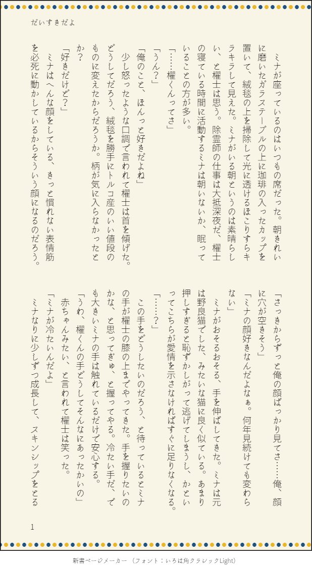 nabisuke☆quiet followMOURNING休みの日のミナ櫂ちゃん。イチャイチャしてるやつ。 ##ミナ櫂 show all(+1 images) Tap to full screen (size:618x1132).Repost is prohibited Let's send reactions! freqpopularsnackothersPayment processing Replies from the creator Follow creator you care about!☆quiet follow nabisukeDOODLE夜のお花見🌸 3 nabisukeDOODLEバレンタインネタ💝と🍌 3 nabisukeDOODLE君の好きなもの深夜の串カツ屋 3 nabisukeDOODLE恋のミニチュアガーデン🍙🍮 3 nabisukeDOODLEあまい味、甘いわな🍠🍕 4 nabisukeMOURNING🔺ぶつ森をする馨さん。 recommended works nabisukeMOURNING除霊師×会社員6👻 3 nabisukeMOURNING除霊師×会社員7👻本にするとき多分冒頭になるやつ 3 nabisukeMOURNING除霊師×会社員9👻 4 nabisukeMOURNING除霊師×会社員8👻櫂士とお母さん(と素っ気ないミナ) 3 nabisukeMOURNINGキャラクター設定 2 nabisukeDOODLEモブ視点。ミナ櫂ちゃんが無意識いちゃいちゃで除霊しちゃう話。 2 nabisukeDOODLEミナ櫂ハロウィン🎃👻甘め 4 nabisukeMEMO別れそうなミナ櫂 3 cynicwsDOODLE程光ブツは見えないようにしたけど普通に致してますいつまでも年末年始を引きずっている 2