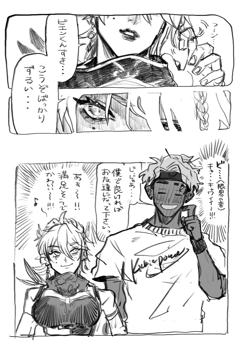 sinonome808☆quiet followDOODLE【※もはや夢※】このツイートがキュンしすぎて思わず描いてました、、、。ほんっっっとにかわいい~~~~~~~~~~!!!!!ビエンがご飯食べれない分いっぱいアビさんにごはんたべさせたいです。。。 Tap to full screen (size:4134x5944).Repost is prohibited Let's send reactions! freqpopularsnackothersPayment processing Replies from the creator Follow creator you care about!☆quiet follow sinonome808DOODLE【※もはや夢※】大好きなマイメン眠眠と~!2人合わせて眠眠鼻炎なんだよ〜〜〜〜〜〜「眠眠のリアコのみんなごめんな~~~????」ってマウントとる遊びがビエンくんの中で流行ってるんだよね。僕らマブだから~~~!!!一緒にお祭りだって行っちゃうしクラブで遊んだりしちゃうのよ~~~~~!!!!!!多分遺伝子同じ、似てるよ、僕たち。。。 sinonome808DOODLE【※もはや夢※】グリ書推し二人のSPというか用心棒になるんだけど、二人とも美しすぎてほんと直視できないし、でも見守ってなきゃいけないし、目と目があったら瞬間好きだと改めて気づかされちゃうし、きっとどぎまぎしてるビエンのことなんか何もかもお見通しで二人でいじり倒されるんだろうなと思います。ありがとうございます・・・・この後変な人に声をかけられますがビエン君が筋肉の圧で制します。きっと sinonome808DOODLE【※もはや夢※】トキくん~~~!!ダンサー仲間だし作業仲間だよ。。。練習した後にファミレスとかでお互いの作業を黙々とやりあう仲だといいね^^ sinonome808DOODLE【※夢※】続かない一コマ。私服で歩いてる時にバッタリ鉢合わせてすぐ気づかれたあげく墨入ってるのバレて「あーあー、こんなんで会社いってるんですか?」って言われて新しい扉が開くビエン。この後ドキドキして練習に行くし「明日の朝どんな顔して会いに行けばいいんだ~~~」って悶々する。(会いに行くことに変わりはない) sinonome808DOODLE【※もはや夢※】このツイートがキュンしすぎて思わず描いてました、、、。ほんっっっとにかわいい~~~~~~~~~~!!!!!ビエンがご飯食べれない分いっぱいアビさんにごはんたべさせたいです。。。 sinonome808DOODLE【※夢※】続かない一コマ。朝さん顔が良すぎて、、、!毎朝顔がいい書店員さんを見て目の保養する為に通勤路を変えるシンプルにキモイ社畜。たぶんバレてる。