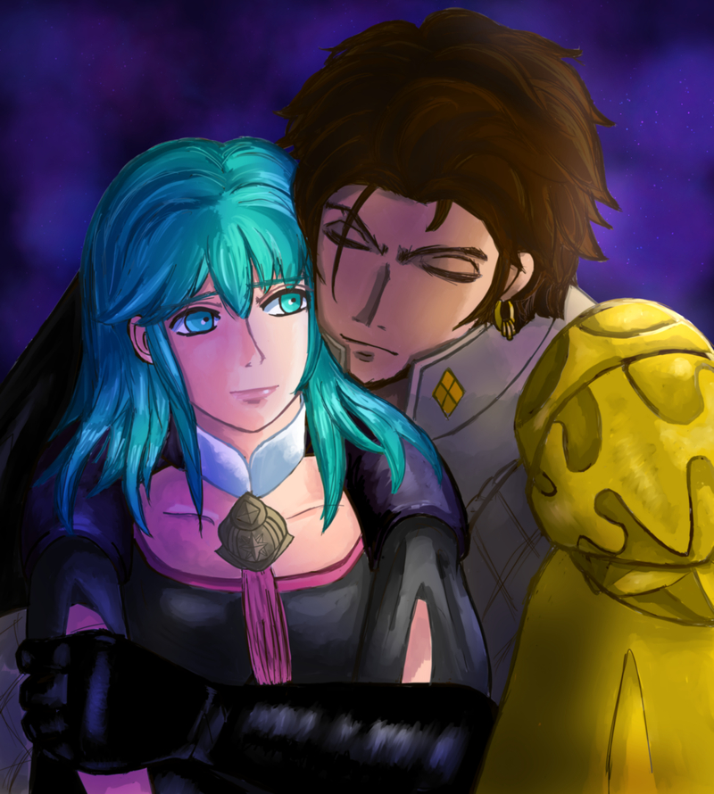 バックハグ盟主版。「女神になんてさせない」です。5年も経ったので級長時代より気持ちの重みが増した盟主を描きたい!となった絵。クロードは先生には女神じゃなくて人としての「異物」として共に歩んで欲しがりそうという解釈から。戦技名が「落星」なの、ホントずるい。