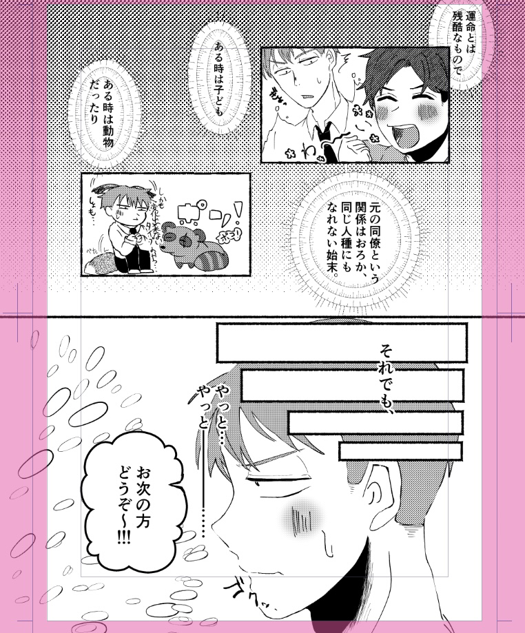 この前もポイピクに載せた(https://poipiku.com/1360909/10100555.html)世界無限ループ🦊モブ同僚くん×俳優?水キなパロ同僚水ペン入れ状況。