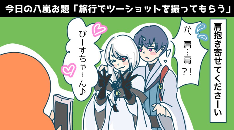 2人で旅行か…いいね。見聞のことかな(三人目がカメラ係か。この後八せが気を使って、三人目と嵐せつでなぜかツーショとるはめになるやつかな)。八嵐
