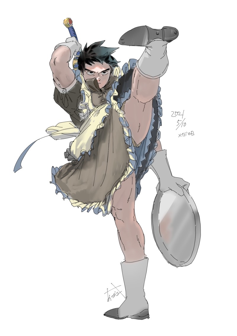 メイド服は防具なので普通にこれで戦うでしょの絵。左手にシルバートレイ。