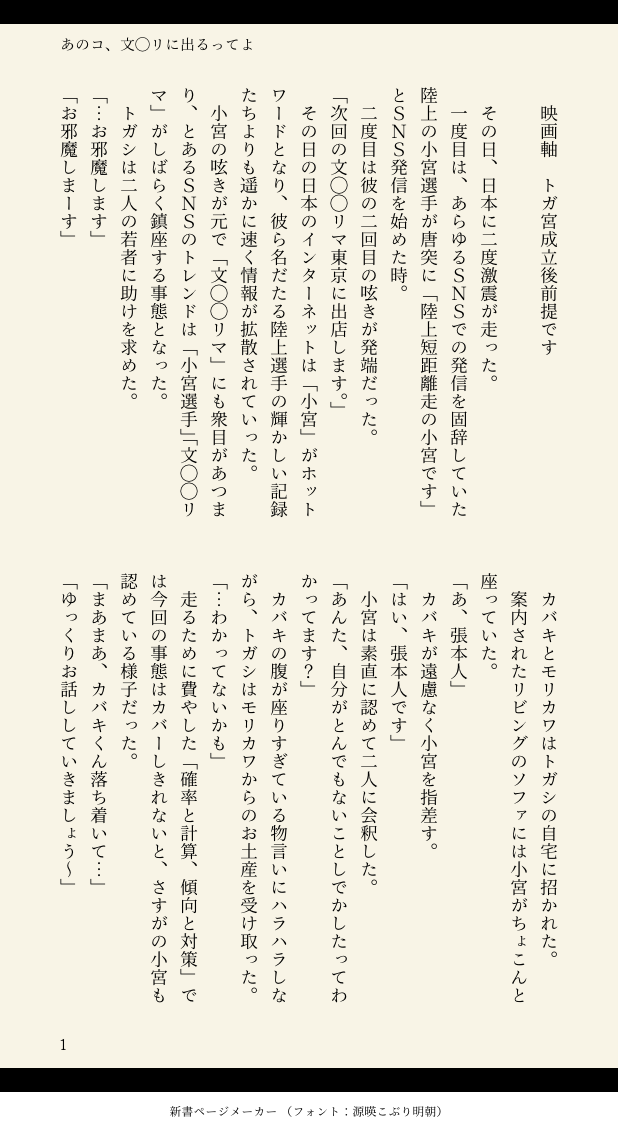 uhooo_i☆quiet followTRAINING💯Ⓜ️映画軸本編後 トガ宮成立前提5月オンリーに頒布予定の本の習作です。コ宮くんが文◯◯リマに出ると言い張ります。 show all(+2 images) Tap to full screen (size:618x1132).Repost is prohibited Let's send reactions! freqpopularsnackothersPayment processing Replies from the creator Follow creator you care about!☆quiet follow uhooo_iTRAINING💯Ⓜ️映画軸本編後 トガ宮成立前提5月オンリーに頒布予定の本の習作です。コ宮くんが文◯◯リマに出ると言い張ります。 3 uhooo_iTRAINING性描写なしやんわりキスありBL書き殴りでごめんなさい 5 uhooo_iDONEメロつかないBLです 3 uhooo_iTRAININGベタなシチュが書きたくて書きました。 4 uhooo_iCAN’T MAKEゆるゆるにゆるいBLですBL書けるようになりたいです 3 uhooo_iDOODLE自己満足らくがき似せられないです…(慟哭)
