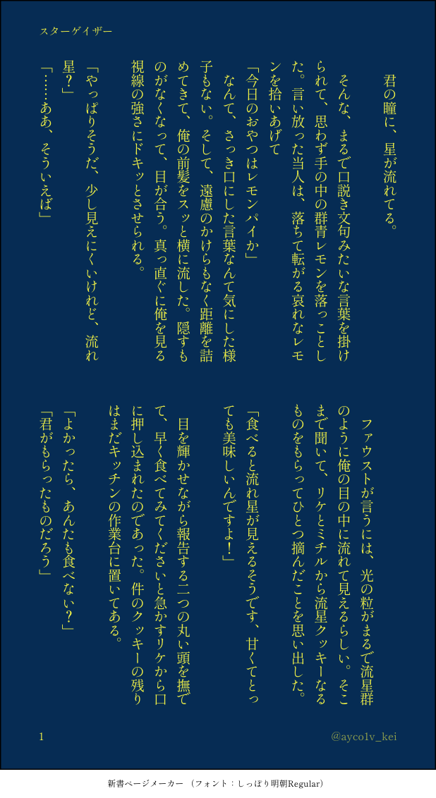 🌕 🌊☆quiet followMOURNING以前、今週のネロファウのお題「君の瞳に」をお借りしてTwitterに上げたものです。 #ネロファウ neroFau show all(+3 images) Tap to full screen (size:618x1132).Repost is prohibited Let's send reactions! freqpopularsnackothersPayment processing Replies from the creator Follow creator you care about!☆quiet follow 🌕 🌊PASTネロファウ晩酌アンソロ「MAKE A TOAST」に寄稿したもののWeb再録です。ネロとファウストが北の方に飛んで酒を飲む話。 5404 🌕 🌊INFO現パロ、くっついて10年選手のネファのファウストがどうにかして過去のネロの童貞を食えないものかと考えてしまったことから始まる話です。タイトルのとおり、キャラ崩壊あり、えっちありの何でも許せる方向けの本になる予定です!来年出します!何月かはわかりません……冒頭ちょっぴりとすけべ部分の一部をどうぞ。 4078 🌕 🌊MOURNING現パロオンリーでひっそりリアルタイム更新していたフォ学番外編のネファ(+ぬい)です。当日読んでくださった方々、ありがとうございました! 28 🌕 🌊DONE夏はあつくてとけてしまう(完全版)夏のフォル学ネファ。一線を越えるか越えないか。全年齢版(Twitter)+ちょっといかがわしい版(もちふた)18歳以上の方ですか? 27 🌕 🌊DONEパジャマパーティ、おさなな就寝後のネロファウ(未成立)ねふぁの湿度高め。いずれ成立する。 1840 🌕 🌊MOURNINGホラーな目に遭ってるのはネロだけ。ブとズとフィとシャも少し出る。 1070 related works 🌕 🌊DONE夏イベの幻覚ネファ(まだ付き合ってない)三人不在の魔法舎でのファウスト+α 10 moegistDONEあらしの谷でしっぽりいちゃいちゃするの好きすぎ問題成人向け・高校生不可18歳以上ですか? 10 🌕 🌊MOURNING今週のネロファウ様よりお題「おそろい」「全部、酒のせい」をお借りしました。 2 🌕 🌊MOURNING今週のネロファウ様より「夜明けを前に」をお借りしました。 🌕 🌊DONE特に何があるわけでもないネファ 亘理湯DOODLE目を閉じて、せーので魔法を唱えて女性になってほしい。ネロファウで女体化ネタ。なんでも大体許せる人向け。 2 🌕 🌊MOURNING以前、今週のネロファウのお題「君の瞳に」をお借りしてTwitterに上げたものです。 4 kannanininiDOODLEおたまほ2にて展示していた、いちゃつくネロファウです※一部トレス 🌕 🌊MOURNING今週のネロファウ様より「真夜中のキッチン」「夏の思い出」をお借りしました。 recommended works 亘理湯DOODLE呼吸が楽になる。 早寝(あこ)DONE #今週のネロファウ「そういうところも好き」 3 亘理湯DOODLE楽しいね🍻 亘理湯DOODLE「今夜も酔っ払うとほっぺたを寄せてくる200歳年上の友人がかわいい」(ネロファウ) 亘理湯DOODLE落書き詰め・海遊びするネファ(よんださんへのお誕生日プレゼントリクエスト!)・ラッキースケベの厄災・むちをもつファウストはかわいい・家でくつろいでTVみてたら宅配便が着て焦る現パロファ。ダボシャツ受けに着せたい症候群。 4 ルイPROGRESSネロファウ幸せになってくれよな…の落書き 線画かけた ルイDONEネロファウおめでとう幸せに暮らしてくれ 19汰DONEもちふた2展示です。ブラッドリー視点のネファです。読んだよ感想もらえると嬉しいです! 6 gin_weofDONEネロの脚元でサブスペースに入ってるファウストを偶然見かけてしまったシノが、ネロにめちゃくちゃディフェンスされる話。ネファとヒスシノ。シノがちょっとかわいそう。ネロはDomらしくキレてる。これ(https://www.pixiv.net/novel/series/8386838)の未来のはなし。 4244