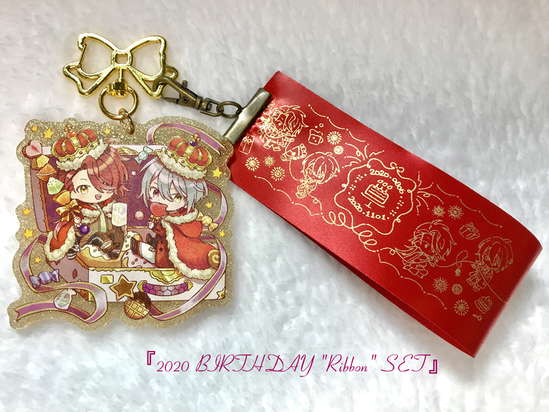 12月カイオエオンリーで頒布を始めたアクリルキーホルダーとリボンストラップのセットで、2020年のカインとオーエンのバースデーを題材にした既刊「Ribbon」のイメージを含めたグッズの写真とリボンストラップの図案です🎀