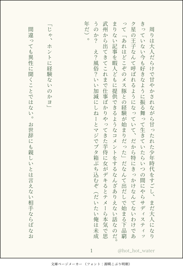 hot_hot_water☆quiet followPAST×過去絵 ○過去SS遥か昔に書いたgntmおっかぐこういうテンポの良い文章書けなくなったな老いかな……… show all(+2 images) Tap to full screen (size:630x928).Repost is prohibited Let's send reactions! freqpopularsnackothersPayment processing Replies from the creator Follow creator you care about!☆quiet follow hot_hot_waterPROGRESS2023.02.23カバーはできた表紙も今日終わらせる……!!!ていうか赤丸のところに切れ込み(?)入ってること今知ったんだが?!?!?!?!?!ほりこし先生細か!!!!ここから着脱できる想定なのかなただ作画ブレてて手のひら手の甲の延長にあるパターンと親指小指の延長にあるパターンがあって正解がわかりません hot_hot_waterPROGRESS2023.02.19ジョちゃんが男と別れた話ラジオ聴きながらで進むわけがなかった2/26までにざわが女と別れた話と合わせて仕上げたいんだが…… hot_hot_waterPROGRESS2023.01.31こっそり進捗(文庫カバー)さっきまで全然ちがうタイトル案で悩んでたのに、ベストラブアーティストのニューアルバム名発表により一瞬で別のものに決まったのであった hot_hot_waterDONEイニシアチブの奪い合い、に見せかけた何か(相ジョ) 3 hot_hot_waterDONE相澤山田が喋ってるだけ⚠︎ほんのりマイミド31巻描き下ろしのミッナイ先生がカジュアル〜〜な格好をしてたので、寮で撮った写真だったらいいなぁなどと思いました 3 hot_hot_waterCAN’T MAKEウキウキな夏希望⛱ 3 recommended works どき屋霊域INFO春コミ新刊おもちゃ本のサンプルです 序盤がちょっとテンポがゆっくりなので、ちょっと多めにサンプル置いておきますね。今回は当社比修正もりもりですがよろしくお願いいたします。※25年12月に再録集に収録予定です 12 sasimiofsalmonDOODLEとけるアイコン ネタバレないけどワンク 11 sirome0_0MOURNINGレッド様とジャックハートさん 169 ぺぺ。SPOILERいわひらげんみ❌ SKPしてる陣は⭕️私の今日のエネルギー見て たわにさんDOODLEいこみず(ワンドロ「肩」で描いたものです。)噛み癖があるイコさん大好き!!!パスワード:18歳より歳上ですか?(y/n) komorikorokoroDONE留伊君が好きだからイチャイチャしてますキスや間接的な表現があるのでR15くらい 5 てつやん🚽DOODLE♡太一は和也のトイレ♡ POI11266326DOODLE 2 くま🐻MENU☕️❤️××にとって次郎とは。🔑俺の_______人 19
