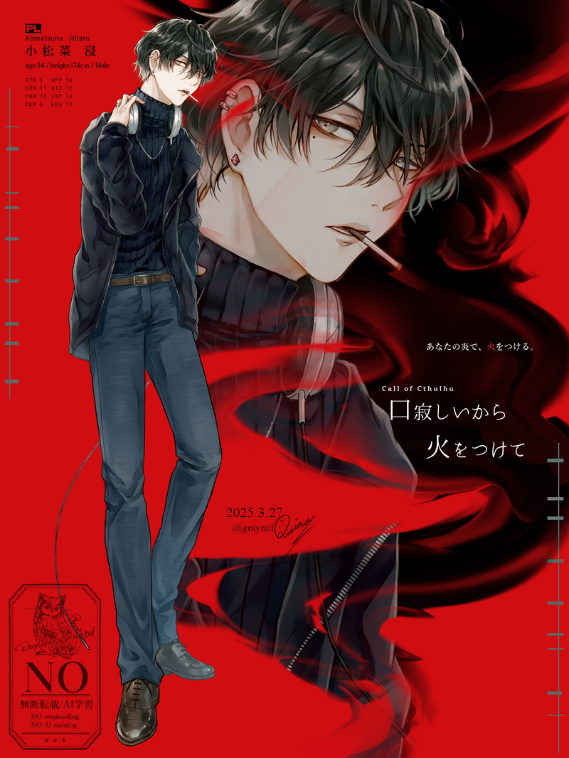 grayrail☆quiet followSPOILERTRPG「口寂しいから火をつけて」※シナリオのネタバレを含みます。未プレイ・プレイ中の方は閲覧をお控えください。 show all(+5 images) Tap to full screen (size:1050x1400).Repost is prohibited Let's send reactions! freqpopularsnackothersPayment processing Replies from the creator Follow creator you care about!☆quiet follow grayrailSPOILERTRPG「Under the S.」※シナリオのネタバレを含みます。未プレイ・プレイ中の方は閲覧をお控えください。※BL要素を含みます 5 grayrailSPOILERTRPG「導禍線」 grayrailSPOILERTRPG「パステルブルーとグッドバイの夢」 grayrailSPOILERTRPG「Hallo,primcy」※シナリオのネタバレを含みます。未プレイ・プレイ中の方は閲覧をお控えください。 3 grayrailSPOILERTRPG「やさしい朝をくださいね」※シナリオの重大なネタバレを含みます。当シナリオ及びTRPG「孤独な鯨は何を願うのか」を未プレイ・プレイ中の方は閲覧をお控えください。 7 grayrailSPOILERTRPG「アンダーテリング」※シナリオのネタバレを含みます。未プレイ・プレイ中の方は閲覧をお控えください。 14