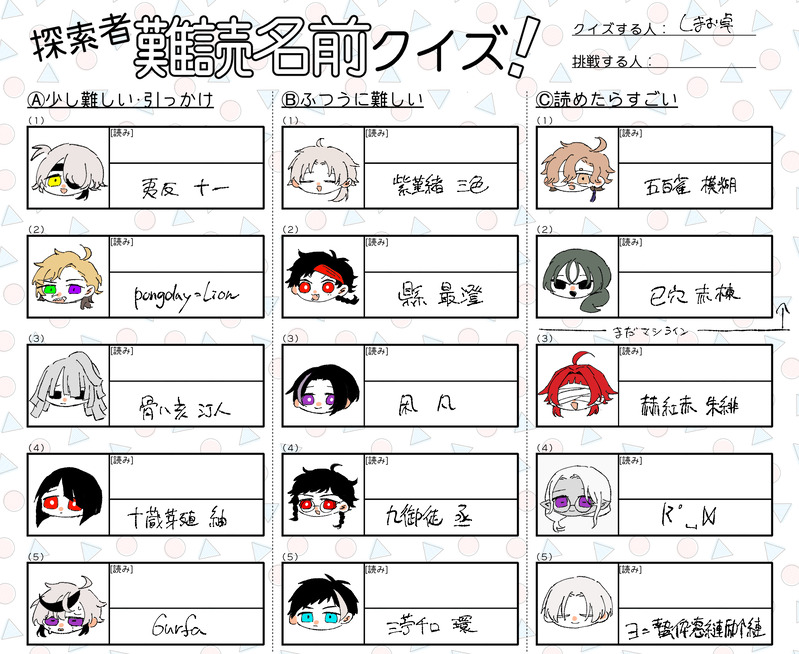しまおのらくがきちょう☆quiet followDOODLE名前当てゲーム答え付き!よく架空の苗字を作ります。下の名前は名付けランキングでよく決めます。そうじゃない時もあります。遊んでくれた人センキュー🫶🫶 show all(+2 images) Tap to full screen (size:2048x1676).Repost is prohibited Let's send reactions! freqpopularsnackothersPayment processing Replies from the creator Follow creator you care about!☆quiet follow しまおのらくがきちょうDOODLE四季送り ⚠げんみばつムズすぎんだろ…… しまおのらくがきちょうDOODLEマイディア🌹差分などをざつにぶち込んだ 5 しまおのらくがきちょうDOODLE@trpg_tlネタバレあるので花ヶ丘未通過は❌花ヶ丘他校組継続いってるよ〜〜🌸🌸🌸使ってないのもある 6 しまおのらくがきちょうDOODLE昨日のバニーの日らくがきまとめ 5 しまおのらくがきちょうDOODLE純愛性 2枚目以降ネタバレ有使ったものたち〜〜〜〜〜〜〜〜 7 しまおのらくがきちょうDOODLEヶ丘 雑らくがき げんみ❌FB〜〜〜💜💜 2