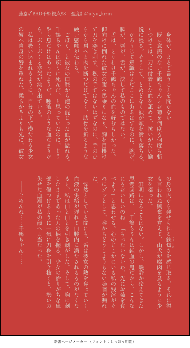 冷や汁☆quiet followDONE多分寒い頃に書いた千姫×千鶴のSS。CP名が分からない……せんちづ?例の藤堂√バッドエンドからの二次創作ですので、お気をつけください。 #薄桜鬼 usuzouki #SS #百合 Lesbian Tap to full screen (size:618x1132).Repost is prohibited Let's send reactions! freqpopularsnackothersPayment processing Replies from the creator Follow creator you care about!☆quiet follow 冷や汁DOODLE秋田君 冷や汁DONE転生フェルマイ 冷や汁DONE刀SS。とある本丸からの手紙。 冷や汁MAIKINGロゼマちゃん〜! 冷や汁DOODLEゾッとする一期一振 冷や汁TIRED途中で書くのをやめた朝菊 related works くぅちゃDONE斎藤しゃん、久しぶりに描いた(*´ω`*) あんどういろはPASTたまには版権というか二次創作というかファンアートというかも薄桜鬼の土方副長洋装 ミエイPAST全部やまちづ 26 くぅちゃDOODLE眠くて描いてみた darumaxnetDOODLE沖田夫妻が井吹夫妻のお家に遊びに行った小話(2枚) 2 manhimeTIRED #薄桜鬼SSL斎千噛み付きver.をツイッターに上げたので、こっちは放置中… 冷や汁DONE沖千バッドエンドSS 2 manhimeMOURNING #薄桜鬼ツイッターに上げた墓守斎藤さん(公式設定集の)色合いを加工してない方 冷や汁DONE多分寒い頃に書いた千姫×千鶴のSS。CP名が分からない……せんちづ?例の藤堂√バッドエンドからの二次創作ですので、お気をつけください。 recommended works マナタマユムDOODLE長義くん可愛いよ#刀剣乱舞 sheep_hituziDOODLEうちの本丸はまだまだお正月なのです ななくさDOODLE三日月さん想い人に口説かれて欲しい。 とまりDOODLE行光、玉集め頑張ってます。 マナタマユムDOODLE #刀剣乱舞 azutyaDOODLE #山姥切#とうらぶ#刀剣乱舞 azutyaDOODLE忘れてた。白山で力尽きてた。すまん。#山姥切長義 #刀剣乱舞 #とうらぶ の〜づDOODLE久しぶりのろしでうまく描けない オミミミミDONEはかたくん