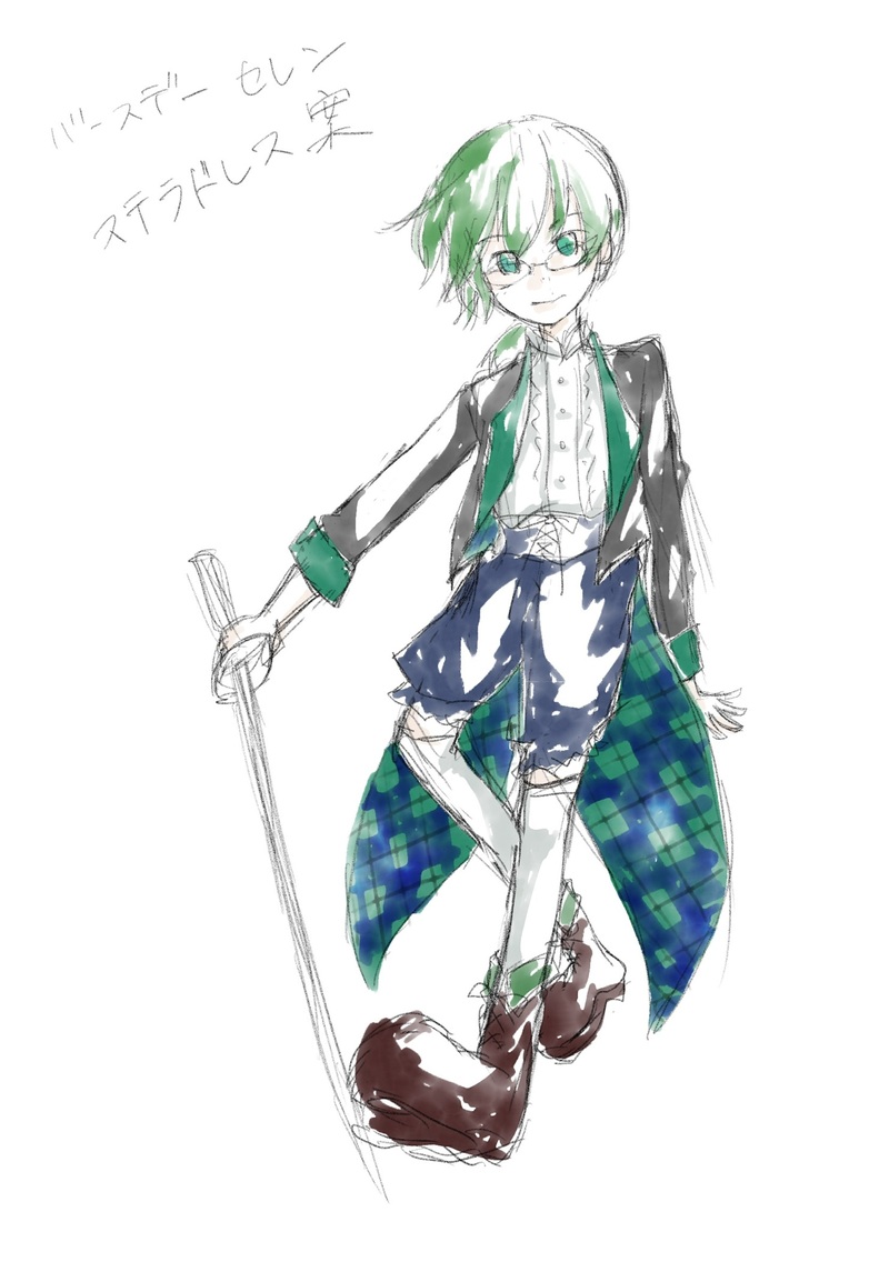 セレンのステラドレス案。バースデーのとき固めたやつ。終焉案は騎士っぽい、こちらは燕尾服ぽい。かぼちゃパンツを履ける年齢は短い。