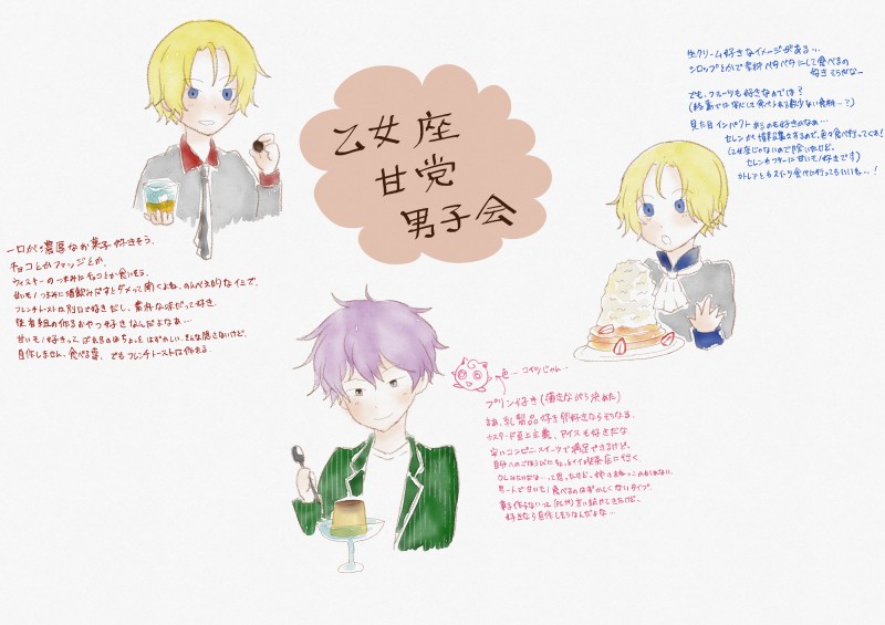 乙女座甘党男子会。表に出してないPC誕生日ですが、そこそこ近い人たち甘い者好きだったので。細かい説明には、出してないPC同士の絡みがチラチラしてます。