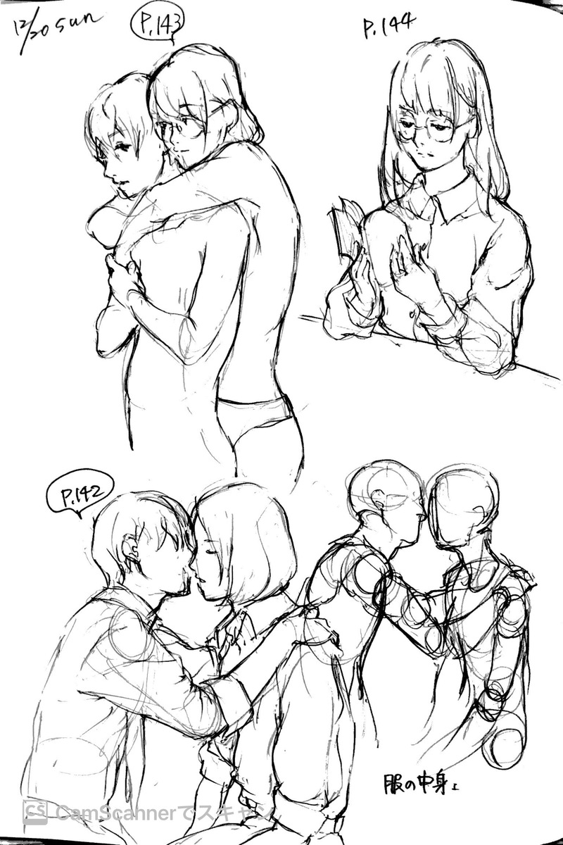 ※超技巧!人物作画テクニックP.142~144 より模写前に描いた「クッションを抱きしめる図」の応用なんだろうけど、同じ空間に複数人描くのは時間かかるし形も狂う。