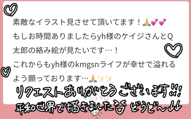 yh@tskmjsk8☆quiet followDONE【マシュマロリク】ケイQケイです!平和世界でほのぼのと仲良くしてもらいました😉2人とも死ぬ程食いそう🍔リクエストありがとうございました💓 show all(+1 images) Tap to full screen (size:1111x692).Repost is prohibited Let's send reactions! freqpopularsnackothersPayment processing Replies from the creator Follow creator you care about!☆quiet follow yh@tskmjsk8DOODLE玉緒くんにバケハ被せたかった結果大人になった玉バン(妄想)になりました。捏造だから一応ぽいぴくにワンクッション〜🐶しかしやっぱピチTか或いは紫芋じゃないと満足(?)できない体になっちまったよ… 2 yh@tskmjsk8SPOILER【ミニエピサラ編ネタバレ⚠️】衝動で描いたのでとても汚いです読みにくくてすみません…! 6 yh@tskmjsk8DOODLE⚠️佐藤ミニエピ僕達は家族だった yh@tskmjsk8SPOILER⚠️カイさんミニエピソードネタバレ有⚠️気付いたことを思わず描いたラクガキです 3 yh@tskmjsk8DOODLE【GS4】だぁ~~~~~(中略)~~~~ほん!初描きしちゃった…しゅき yh@tskmjsk8DOODLE度重なる体調不良にムシャクシャした結果生まれたNsコスな主夫+DK組のらくがきです🩺💊💉私の頭診察して🏥⚠️女装注意 3
