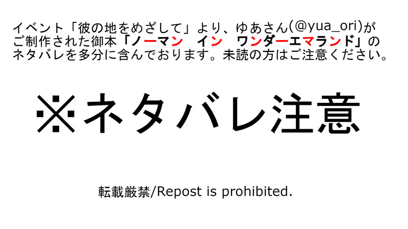 イベント「彼の地をめざして」より、ゆあさん(@yua_ori)がご制作された御本「ノーマン イン ワンダーエマランド」の神プロットを拝見させていただいた際に作成したものです。