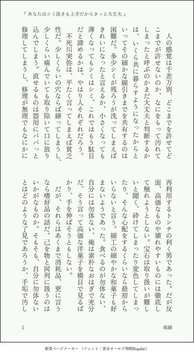 vague_blue☆quiet followDONEわたしの考えるリアルなさねぎゆを書きました。なんか、そのうち下克上しちゃいそうな🌊さんです(うちは🌊受固定なのでそういう日は永遠に来ないんですけど)私に情緒あるさねぎゆは書けない… show all(+11 images) Tap to full screen (size:618x1132).Repost is prohibited Let's send reactions! freqpopularsnackothersPayment processing Replies from the creator Follow creator you care about!☆quiet follow vague_blueDOODLE明るい生存IFの煉義です。🌊さんにお持ち帰りされる🔥さんの話になりました。 13 vague_blueDONEまさか令和の世にこの詩を引用するとは思わなかったんですが、当てはめていったら案外良い感じに収まる気がしたので、軽率に拝借しました。みんな生存IFで、柱×🌊さん風の話です。こんな感じの温度感だったらなぁぁぁあ願望を詰めてみました。 15 vague_blueDONEあーあ、悲鳴嶼さん+宇髄さん×冨岡さんの愛ある3P読みたいなぁという妄言から、色々あって書いてみました。No.0039さんの案を遠慮なく拝借してオメガバ設定です。ちょっと自分の性癖が大爆発を起こして、色々面倒なことがあって覗いてる不死川さん+煉獄さん視点という逃げ‥‥ニッチな切り取り方をしてるので、諸々ご理解の上、ご容赦ください。パスワードは、y/nのアレです。 18 vague_blueDONEファンタジー成分過多のさねぎゆです。もろもろ説明不足ですが、いい感じに感じ取っていただけるととても助かります。色々あって最終的に致しますので(表現は前i戯程度)、一応R-18にしてあります。(y/nのアレです) 40 vague_bluePAST以前寄稿させていただいた話の再録です。柱×🌊さんです。総受けです。ゆるくスケベ描写があるので一応R18にしてありますが、ぬるいです!!今思うと、よくこんな攻めた話を選んだな…と我ながら思います……。 23 vague_blueDOODLE現パロ煉義事後だけど本番でもある(説明下手)一応R-18です。パスワードは18歳以上ですかの「y」or「n」のアレです。 4 recommended works りょうかTRAININGさねぎゆ motimoti_babyMEMOGIFを投稿できるかテスト AB泥棒DONE【R-18】主皆 ホールド編 0421happy_lifeDONEさねぎゆ版ワンドロワンライ【お題:不機嫌】で参加させていただきます。キ学軸の一緒に住んでる二人。不機嫌な🌊を🍃が甘やかす話。致してはいませんが、全体的にいかがわしく、ポロリはしてるので。㊟二人の会話の中に🍃に気がある女性が出て来ますので、苦手な方はご注意ください。会話の中だけで、登場はしません。あなたは18歳以上ですか?(yes or no) 4495 kame2kmtDOODLEさねぎゆ さいつよジャンプ9月号ネタらくがきと感想※ネタバレのためワンクッション 3 sngy_srPROGRESSパスワード:成人済みですか?y/n(3文字)新刊の原稿進捗(すけべ)です。tkb責めです。 3 とまとDOODLE春は初恋の季節なので。高3の不死川君が美人の保父さんに一目惚れする話。 804 eoh_202202DOODLE癖詰め自分得でしかないsrさんの後天性TSネタにつき、なんでも楽しめる方のみご覧ください FullavaDONE*下克上彰x新年冬 7k7+*xp瘾犯了所以能看到什么不保证*包含ntr情节 冬有丈夫没抽到新年彰怒写密码彰冬日 7693