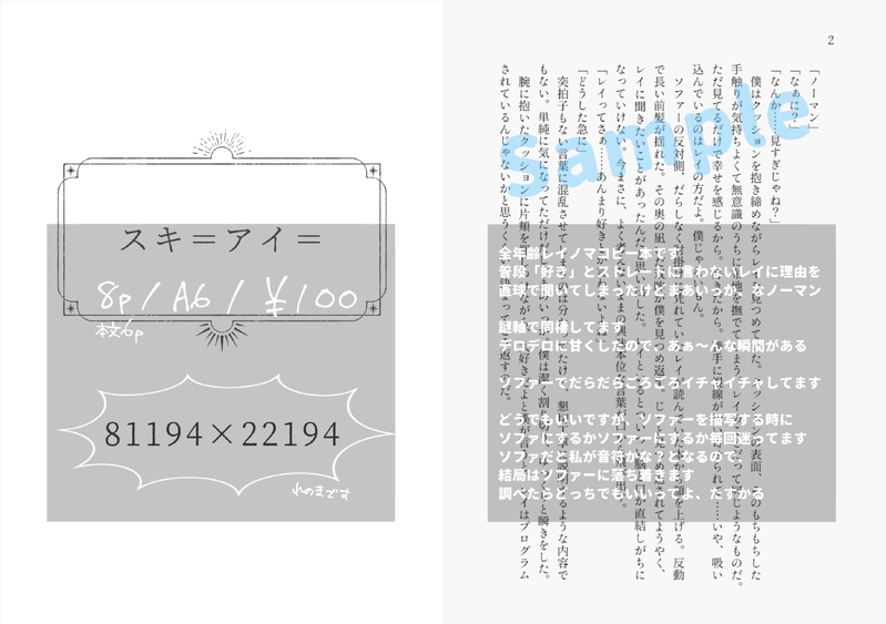 まつしま☆quiet followINFO彼の地3の新刊です好きって言わないレイになんで?なノーマンの話一生イチャついてる Tap to full screen (size:2893x2038).Repost is prohibited Let's send reactions! freqpopularsnackothersPayment processing Replies from the creator Follow creator you care about!☆quiet follow まつしまDOODLEエマ王子とギルダ姫が書きたかっただけです…満足…あんこさんのエマギル感想イラストからインスパされた4次創作とかいうややこしいやつ 772 まつしまMENUお品書きです!ギルダちゃんのブロマイドそんな数作れなかったのでどうしても…(血涙)の方はご連絡ください 3 まつしまINFO【sample】ギルダちゃん写真集の中でお気に入りを厳選しました! 2 まつしまINFO【sample】ノーマン写真集Eve&Maria特典ブロマイドの紙ちょっといいやつです 5 まつしまPROGRESS1/26に持っていく名刺ができました無配クオリティですレイくんだけスマホ自撮りなので画質が粗い まつしまINFO彼の地出ます recommended works のんたDOODLEノマエマ 糸電話 はこちゃんDONE ash92746280PAST最近過去絵しか晒してない @twst4192stDOODLE約ネバ読んだ記念に ***DOODLE夜 真星重就DOODLE支部に載せたものと同じ内容になります。クワンガーさんの夢小説です。駄文につき見づらいかと思われますが、それでもよろしければお進みください。駄文です(2回目)psw→18歳以上ですか?(yes or no) 946 やすけ@さくらうさぎ御殿MOURNING弱ペダ 御堂筋翔夢昔書いていた「一握の黄色」という作品の冒頭部。完結できなかったの哀しい。 5 やすけ@さくらうさぎ御殿DONEイナイレ 鬼道夢昔書いていた「恋風」という作品のスピンオフの一部。空中分解。 5 ナユタDOODLE🍑ガブッ