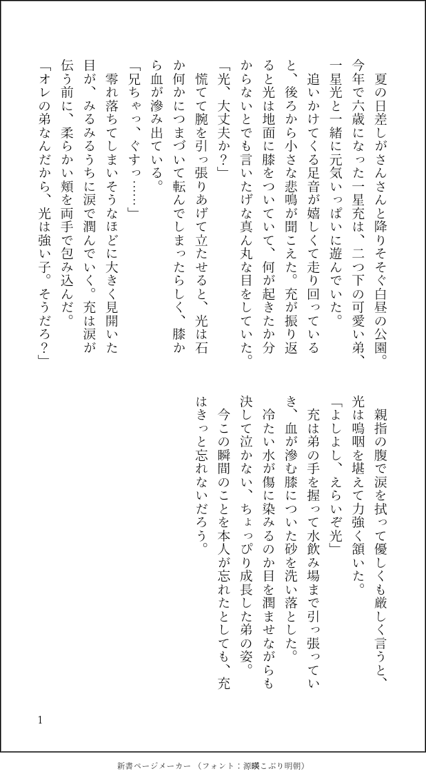 (*ΦωΦ*)☆quiet followTRAINING転んで痛くて泣きそうな光と弟には強く育ってほしいと思う兄ちゃんは可愛いです Tap to full screen (size:618x1132).Repost is prohibited Let's send reactions! freqpopularsnackothersPayment processing Replies from the creator Follow creator you care about!☆quiet follow (*ΦωΦ*)DOODLE犬の日らしいっすね。寝ぼけて獣感強めなコミュ(噛み)ニケーションする「やだなぁ、耳と尻尾がついてるだけで僕はみんなとなんにも変わらないよ」とか言ってそうな人狼一星兄弟 1528 (*ΦωΦ*)DOODLEキョンシーコス一星を見て思いついたものその3。生存ifみつひか。一星充(15)に変なお札描かれたキョンシー光(13)。そして息をするように不在のパパ 3682 (*ΦωΦ*)DOODLEキョンシーコス一星を見て思いついたものその2。その1とは繋がりがありそうな無さそうな。アレオリ時空的にあの世界でイナズマジャパンのグッズ販売してそうという思いつきその2。画像をズームして見ただけなので実際のものと書いたの違ってるだろうなぁ…… 6375 (*ΦωΦ*)DOODLEキョンシーコス一星を見て思いついたものその1。アレオリ時空的にスポンサー契約やらなんやらで広告塔的な役割ある=グッズとか販売してそうという安易な思いつきその1 3015 (*ΦωΦ*)DOODLEスープ作るときに歌うと紛らわしそーな曲をラジオで聴いたとです。みつひか年齢操作に捏造たっぷり 4401 (*ΦωΦ*)DOODLEマチカネ厄キタルっぽいの。 6190 recommended works みなづきDOODLE今日のみなづきのアシュピオ宅飲みで酔って絡み酒。最終的に気分を悪くし介抱された挙句抱き着いたまま寝落ちる。#今日の二人はなにしてる #shindanmakerhttps://shindanmaker.com/831289 3 SasameDONE細雪んちの獠さん香ちゃんで「眠り姫」と「愛する者」のお話はどうでしょう? 3ツイート(420字)以上だと嬉しいですっ!#CHしたったー #shindanmakerhttps://t.co/ou3tHxbMVH寝起きからのお題 mu_ra_btDOODLEうさぎの肉球が毛深いと聞いて触って確かめたくて仕方ない月咲桂花#なんとなく可愛い #shindanmaker aosabikinakoTRAINING貴方はチア相で『死ぬまでの君を全てください』をお題にして140文字SSを書いてください。#shindanmakerhttps://shindanmaker.com/375517 aosabikinakoTRAINING貴方はチア相で『ちょっと黙って』をお題にして140文字SSを書いてください。#shindanmakerhttps://shindanmaker.com/375517 SasameDONE貴方は細雪んとこの獠香で『頬に爪を立てる』をお題にして140文字SSを書いてください。#shindanmakerhttps://t.co/Ec3adYSLmi乁( ˙口˙ 乁)シャァァァァア 166 SasameDONE貴方は細雪んちの獠香で『誰にも渡さない』をお題にして140文字SSを書いてください。#shindanmaker😑😑😑 taniryumaXXXDONE💜💙「きっぷ」or「ていねい」で詠んでみました。「きっぷ」が4で、「ていねい」が2です。#お題ガチャ #paro_tanka_odai より42短歌。 3 ジオさんちMAIKINGにほさにワンライ。女審神者。『食欲の秋。食べすぎたからとダイエットをしようとするさにちゃんと、太っていないからと新たな秋の味覚を準備する号さんの攻防が今日も始まる。』#お題ガチャ #同棲カプのゆるい話 1114