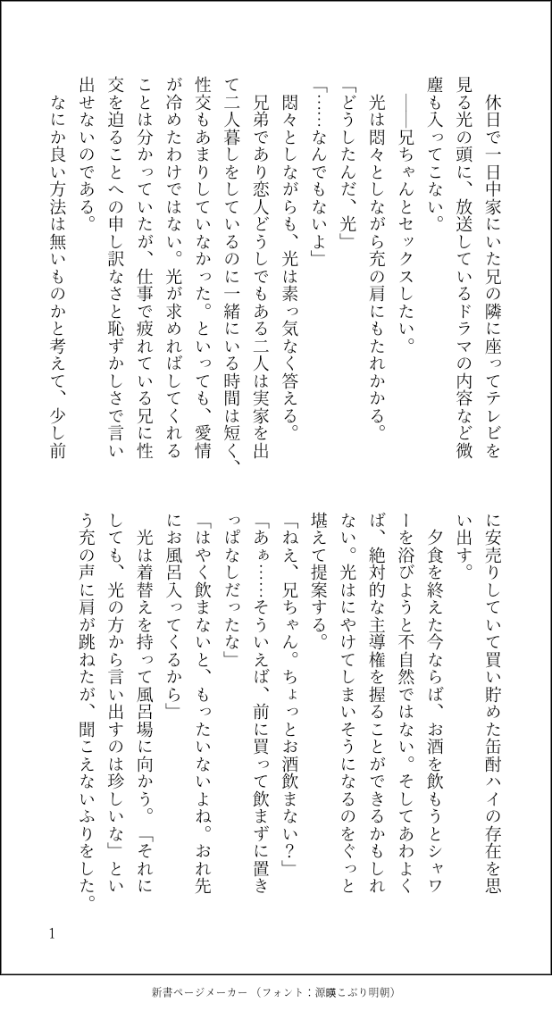 (*ΦωΦ*)☆quiet followDOODLE攻めに言わせるセリフの診断メーカーをやったはずなのに受けバージョンのリンク押してたらしくてとっても悔しくなったけど、「俺を酔わせてどうするつもり?」って言う攻めがいたっていいじゃない!(負け惜しみ)ってことで書いたよね。生存if、二人暮ししてる社会人の充と大学生の光。 show all(+4 images) Tap to full screen (size:618x1132).Repost is prohibited Let's send reactions! freqpopularsnackothersPayment processing Replies from the creator Follow creator you care about!☆quiet follow (*ΦωΦ*)DOODLE犬の日らしいっすね。寝ぼけて獣感強めなコミュ(噛み)ニケーションする「やだなぁ、耳と尻尾がついてるだけで僕はみんなとなんにも変わらないよ」とか言ってそうな人狼一星兄弟 1528 (*ΦωΦ*)DOODLEキョンシーコス一星を見て思いついたものその3。生存ifみつひか。一星充(15)に変なお札描かれたキョンシー光(13)。そして息をするように不在のパパ 3682 (*ΦωΦ*)DOODLEキョンシーコス一星を見て思いついたものその2。その1とは繋がりがありそうな無さそうな。アレオリ時空的にあの世界でイナズマジャパンのグッズ販売してそうという思いつきその2。画像をズームして見ただけなので実際のものと書いたの違ってるだろうなぁ…… 6375 (*ΦωΦ*)DOODLEキョンシーコス一星を見て思いついたものその1。アレオリ時空的にスポンサー契約やらなんやらで広告塔的な役割ある=グッズとか販売してそうという安易な思いつきその1 3015 (*ΦωΦ*)DOODLEスープ作るときに歌うと紛らわしそーな曲をラジオで聴いたとです。みつひか年齢操作に捏造たっぷり 4401 (*ΦωΦ*)DOODLEマチカネ厄キタルっぽいの。 6190 recommended works (*ΦωΦ*)DOODLE貴方はみつひかで『「新手の誘い文句ですか?」』をお題にして140文字SSを書いてください。#shindanmakerhttps://shindanmaker.com/587150表に出したやつにおまけをつけただけ。実は結構前から覗き見してた兄ちゃん視点のおまけだよん。兄ちゃんの枕を兄ちゃんと想定してちゅっちゅしたり跨ってみたりする光を見たかっただけ感!生存ifみつひか 3 (*ΦωΦ*)DOODLEひかるの恋人のフリをすることになったみつる#お題ガチャ #2W1Hガチャ_amaama https://odaibako.net/gacha/617?share=tw文化祭で女装させるネタは何回でも考えてしまうね!!というわけでポイピク行き。生存ifみつひか。兄ちゃん大学生、光高2。息をするように両片想いにしてるね。キレたら何をするか分からないゼってイキってるモブになりてぇです 6 おマメREHABILIこの間の続きのやつ色んな時空のキリユジ見たい tada4kaiTRAINING南悠理 ネタバレはない南 悠理のお話は「幸せになってください」という台詞で始まり「何か言いたかったけれど、言葉がうまく出なかった」で終わります。#shindanmaker #こんなお話いかがですか 1104DOODLEお題ガチャより ma_wata776MOURNINGウツハン♀︎貴方はうは♀︎で『大人の定義』をお題にして140文字SSを書いてください。#shindanmakerhttps://shindanmaker.com/375517上手に出来るか、出来ないか ゆるかMAIKING犬も食わないの第3話です。更新おっそ!!!今回ダミちゃがモブ女に一方的にキッスされちゃいますが、許してくださいませ。NGな人は読んじゃダメです🙅♀️ダニャ成長if診断メーカーのお題を消化しています。あなたは4RTされたら「迎えに来たぜ、お姫様」の台詞を使ってゆるかのダニャを描(書)きましょう。#shindanmakershindanmaker.com/528698 12786 titose0401hDONE貴方は洋花でチトセで『君の気配』をお題にして140文字SSを書いてください。#shindanmaker書きながら寝落ちしてた😪😴💤好きと気づく前の🌸道。ちなみに🌊平は自覚済み✌️だといいなと勝手に思ってたりしますそんな二人を、はよくっつけ!って思ってる軍団三人🤣 あーるDOODLE1人で買い物に行っても、副都心が欲しがりそうなものをつい見繕ってしまう有楽町#お題ガチャ #推しカプシチュガチャ https://odaibako.net/gacha/963