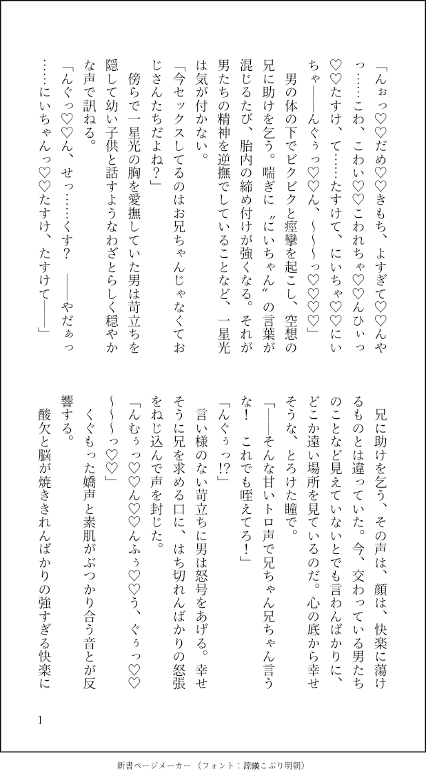 (*ΦωΦ*)☆quiet followTRAININGフォロワーに投げつけたもの。都合により急ぎめで書いたのでいきなり始まるモブレ&雑でホント申し訳ない……充光(人格)前提のモブ光。 show all(+3 images) Tap to full screen (size:618x1132).Repost is prohibited Let's send reactions! freqpopularsnackothersPayment processing Replies from the creator Follow creator you care about!☆quiet follow (*ΦωΦ*)DOODLE犬の日らしいっすね。寝ぼけて獣感強めなコミュ(噛み)ニケーションする「やだなぁ、耳と尻尾がついてるだけで僕はみんなとなんにも変わらないよ」とか言ってそうな人狼一星兄弟 1528 (*ΦωΦ*)DOODLEキョンシーコス一星を見て思いついたものその3。生存ifみつひか。一星充(15)に変なお札描かれたキョンシー光(13)。そして息をするように不在のパパ 3682 (*ΦωΦ*)DOODLEキョンシーコス一星を見て思いついたものその2。その1とは繋がりがありそうな無さそうな。アレオリ時空的にあの世界でイナズマジャパンのグッズ販売してそうという思いつきその2。画像をズームして見ただけなので実際のものと書いたの違ってるだろうなぁ…… 6375 (*ΦωΦ*)DOODLEキョンシーコス一星を見て思いついたものその1。アレオリ時空的にスポンサー契約やらなんやらで広告塔的な役割ある=グッズとか販売してそうという安易な思いつきその1 3015 (*ΦωΦ*)DOODLEスープ作るときに歌うと紛らわしそーな曲をラジオで聴いたとです。みつひか年齢操作に捏造たっぷり 4401 (*ΦωΦ*)DOODLEマチカネ厄キタルっぽいの。 6190 recommended works かほる(輝海)DONEかほるさんちの獠が香ちゃんの髪を梳きながら、「愛している」「大好き」「誰にも渡さない」と睦言を呟くと、照れながら俯いて「うん、うん」と嬉しそうに頷いて微笑んでいる。#shindanmakerhttps://shindanmaker.com/522763原作以上の関係。某漫画から一部セリフを引用。 4 こよみTRAININGこよみんちの獠で「アパート」と「シンデレラ」のお話はどうでしょう? 2ツイート(280字)程度だと嬉しいですっ!#CHしたったー #shindanmakerhttps://shindanmaker.com/965157字数、倍だなwいいの、「だといいな!」っていう字数だから←「シンデレラ」の使い方を悩んでますが、諦めた!素で変化球思考なんです…。お題物は難しいです💦 aosabikinakoTRAINING貴方はチア相で『優先順位』をお題にして140文字SSを書いてください。#shindanmakerhttps://shindanmaker.com/375517 aosabikinakoTRAINING貴方はハル相で『絶対絶命』をお題にして140文字SSを書いてください。#shindanmakerhttps://shindanmaker.com/375517朝の話を夜上げる(朝書けなかった かほる(輝海)DONEシティーハンター冴羽獠×槇村香原作以上の関係。あなたはかほるさんちのRKで【騙されてあげる / 夜まで待てない】をお題にして140字SSを書いてください。待てできない。獠だもの(*´ω`*)#shindanmakerhttps://shindanmaker.com/780366 148 tada4kaiTRAINING南悠理 ネタバレはない南 悠理のお話は「幸せになってください」という台詞で始まり「何か言いたかったけれど、言葉がうまく出なかった」で終わります。#shindanmaker #こんなお話いかがですか koyubikittaDOODLE一緒にいても何とも思わないけど一緒にいなかったらなんとなく不安になる夜帳と比鷺#お題ガチャ #男ふたりの色んなシーン https://odaibako.net/gacha/1739?share=tw早野の夜鷺さんへ贈るタイトルお題は、『書を捨てよ、此処を発とう』 です。#shindanmaker #同人タイトルお題ったーhttps://shindanmaker.com/566033 1772 かほる(輝海)DONEシティーハンター冴羽獠×槇村香原作以上の関係あなたはかほるさんちのRKで【はなさない / 想像してた?】をお題にして140字SSを書いてください。#shindanmakerhttps://shindanmaker.com/780366日付変わっちゃったけど、獠ちゃんハピバ♥ 148 tizyoutoumikmtDOODLE夜遅くに帰ってきたたんじろうが寝室を見るとれんごくさんがYESNO枕を抱きしめて眠っていた。YESの方を向いてはいるけれど今日はゆっくり寝かせてあげることにした。翌朝ちょっとだけ拗ねるれんごくさん。#お題ガチャ #お互いが大切なふたり https://odaibako.net/gacha/5834?share=tw 拗ねる煉さんかわいいなぁ※炭煉