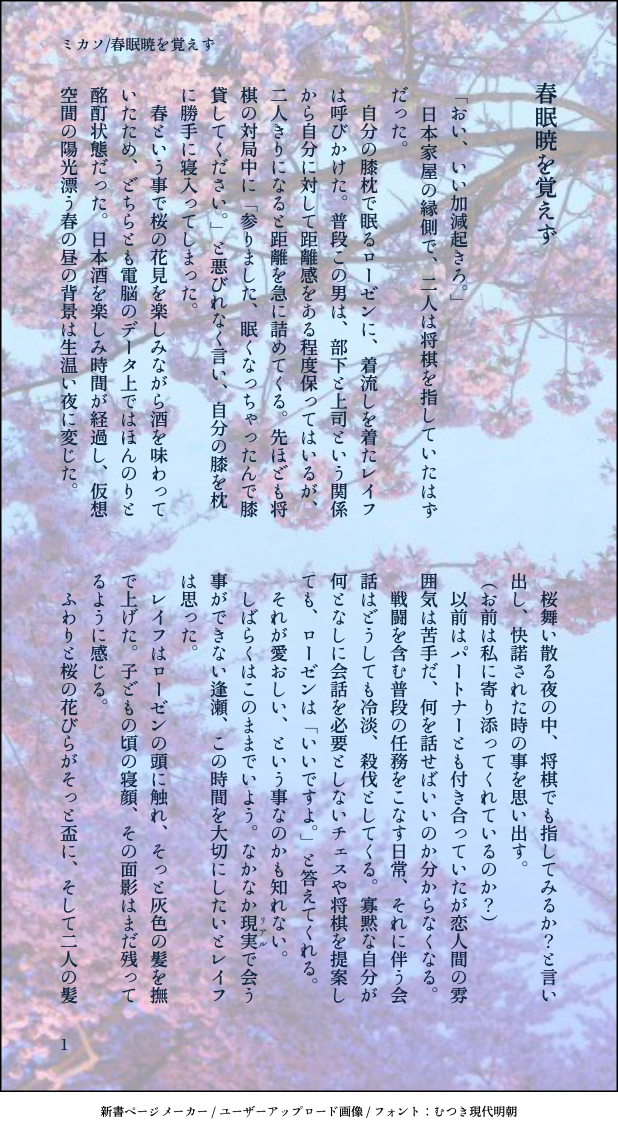 mikaso☆quiet followDONE創作BL企画で書いたSS2枚です。テーマは酔っ払いですが、内容は薄いです😭2人の詳細はこちらから→ https://poipiku.com/IllustViewPcV.jsp?ID=144251&TD=1228756 #創作BL Original Bl #腐向け Rot #小説 novel show all(+1 images) Tap to full screen (size:618x1132).Repost is prohibited Let's send reactions! freqpopularsnackothersPayment processing Replies from the creator Follow creator you care about!☆quiet follow mikasoDONE更新、すごく久しぶりですが書き上げました。今回は家族の話で短めです。 2098 mikasoDONEクロム様お誕生日おめでとうございます🎉元ネタはうな◯いちどうさんです、毎度ネタ絵が多くてすみません🙇 mikasoDOODLEゴッホのアバター絵です、元はうちのこをイメージして作っています。よく本を読ませているので、自分が読んでいる本を描いてみました😀 2 mikasoDOODLE明けましておめでとうございます、今年の年賀状はFEHのレラパパです。今年もよろしくお願いします❗️ mikasoINFO新刊のBOOTH通販開始は2025/1/12以降になります、しばらくお待ちください! 7 mikasoMENU来年1/12のスパコミにサークル参加します!ポスターとお品書きを置いておきます。BL本ばかりなので、大丈夫かつお暇な方は気軽に立ち寄ってね。クロル腐新刊のBOOTH通販開始は1/12以降になります、しばらくお待ちください🙏 4 related works 3kroman2PAST王様と黒騎士。二人が一緒の絵中心。#創作BL #オリジナル 3 たかすんDOODLE ななめDONE過保護なアキラによって、もこもこにされるマサ。 兎守 優(旧:内山)DONE人間嫌いな特殊捜査員の吸血鬼×崖っぷちな搾取される贄刑事 捜査協力の対価は、血液の供給。この男の不可思議な魅力に当てられ、刑事は次第に、彼に全てを捧げていくのだが。 24345 linco_akutaDOODLEとりあえず 3kroman2PAST王様と黒騎士、キャラ単体絵色々。#創作BL #オリジナル 4 3kroman2PAST王様と黒騎士の二人セットに入れ忘れた絵。眠り続ける王様の見る夢。#創作BL #オリジナル たかすんDOODLE昔描いたやつ BLのにしなPROGRESS受君の雄っぱいが上手く描けたから報告です!3pでモブに回されている幸の薄いうちの創作男子君。いつ幸せにしてくれるんだと、苦情の嵐をフォロワーさんから受けていますが、まだ地獄の中です。頑張って幸せにする次第です。 2 recommended works わさびなゆきDOODLE あまかぜDOODLE小ネタとらくがき 9 らんちゅう@skeb受付中DOODLEタグのやつ2枚 2 ありす(元うさ実、マネキネコ)DOODLE創作BL漫画社畜シリーズの陸と湊です♡絵を変えたら多分こんな感じになると思いながら描きました。。今度は斜め顔とか描きたいです♡ ありす(元うさ実、マネキネコ)PROGRESSネームに行き詰まって落書き…してたらもうちょっと描き込みたくなってしまった…( ˙-˙ ; )ラフ画です描いて塗れるかな?? 4時起きDOODLE【創作BL】島高…。高見くんは自分より身長高いひとばっかり好きになる…。 カモンの倉庫裏SPUR ME #創作BL あーん仲良くチョコを溶かす二人 2 あきよしDOODLEハピエン√かもしれない太一と守さん ななめDONEサン・ジョルディの日なので本を贈り合っています。広瀬は猫好きで可愛いものが好き。入江は子どもの頃、恐竜が好きでした。(2022.04.23)
