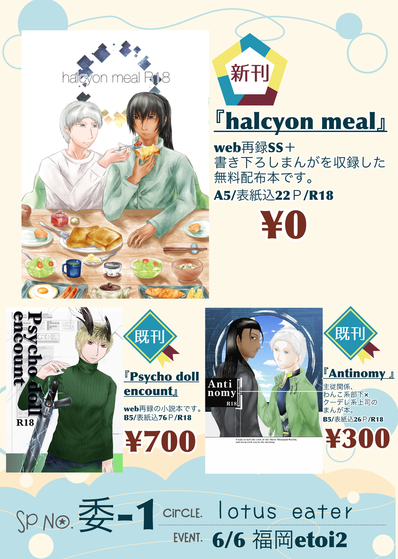 mikaso☆quiet followINFO6/6福岡創作BLイベントetoi2に委託参加します。https://q-etoi.com/top.htmlサークル名はlotus eater、スペースNo.は委−1です。今まで出した既刊、新刊合わせて3種類持っていくのでよろしくお願いします🙇♂️本の詳細はピクシブをご覧下さい。https://www.pixiv.net/artworks/90221310 #創作BL Original Bl #お品書き show all(+1 images) Tap to full screen (size:2551x3579).Repost is prohibited Let's send reactions! freqpopularsnackothersPayment processing Replies from the creator Follow creator you care about!☆quiet follow mikasoDONE更新、すごく久しぶりですが書き上げました。今回は家族の話で短めです。 2098 mikasoDONEクロム様お誕生日おめでとうございます🎉元ネタはうな◯いちどうさんです、毎度ネタ絵が多くてすみません🙇 mikasoDOODLEゴッホのアバター絵です、元はうちのこをイメージして作っています。よく本を読ませているので、自分が読んでいる本を描いてみました😀 2 mikasoDOODLE明けましておめでとうございます、今年の年賀状はFEHのレラパパです。今年もよろしくお願いします❗️ mikasoINFO新刊のBOOTH通販開始は2025/1/12以降になります、しばらくお待ちください! 7 mikasoMENU来年1/12のスパコミにサークル参加します!ポスターとお品書きを置いておきます。BL本ばかりなので、大丈夫かつお暇な方は気軽に立ち寄ってね。クロル腐新刊のBOOTH通販開始は1/12以降になります、しばらくお待ちください🙏 4 related works 3kroman2PAST王様と黒騎士。二人が一緒の絵中心。#創作BL #オリジナル 3 兎守 優(旧:内山)DONE人間嫌いな特殊捜査員の吸血鬼×崖っぷちな搾取される贄刑事 捜査協力の対価は、血液の供給。この男の不可思議な魅力に当てられ、刑事は次第に、彼に全てを捧げていくのだが。 24345 BLのにしなPROGRESS受君の雄っぱいが上手く描けたから報告です!3pでモブに回されている幸の薄いうちの創作男子君。いつ幸せにしてくれるんだと、苦情の嵐をフォロワーさんから受けていますが、まだ地獄の中です。頑張って幸せにする次第です。 2 3kroman2PAST王様と黒騎士、キャラ単体絵色々。#創作BL #オリジナル 4 linco_akutaDOODLEとりあえず たかすんDOODLE昔描いたやつ たかすんDOODLE 3kroman2PAST王様と黒騎士の二人セットに入れ忘れた絵。眠り続ける王様の見る夢。#創作BL #オリジナル ななめDONE過保護なアキラによって、もこもこにされるマサ。 recommended works しいたマ_創作物をお届けDONE川之辺くん(3年)と、姉屋くん(2年)と申します。姉屋は積極的で、見た目大人っぽく見えるけど、ふとした瞬間、甘えっ子。…ひとまずそんな感じです。 上の田んぼMAIKING大狼と兎丸の朝のルーティン┌(┌^o^)┐モワーと電波を受信したのでまんがにしてみました(また次回もうちょっと清書したいと思います汗)兎丸の安眠を邪魔する気はないので、兎丸がぐっすり寝ている間はイタズラしない大狼なのですが、夜中にかわいい無防備な兎丸の寝姿をガマンにガマンしつつ視姦してる分、兎丸が目を覚ました朝は嬉しくて色々爆発してしまう大狼なのでした^0^ 2 春福塩子DONETwitterのヘッダー用に描いた横長いやつ。頑張ったのでこっちにも投げさせて下さい(*´ω`*) 千三百一DONEメモマメイカ(75)「ツヅキ」 volke.DOODLEうちの子『ヘルミーネ・トレーガー』ちゃんと『カール・パーヴェルツィーク』くんのアナログ2Pマンガです♪#うちの子 #ヘルミーネ・トレーガー #カール・パーヴェルツィーク #オリジナル #創作 #パンツァープッペ #アナログ #義手 #子守歌 #軍人 #兵士 #MeinkleinerSchatz #創作マンガ #アナログマンガ 2 きゃびDONE tabaDOODLE 2 nap_p6DOODLE18歳以上ですか?(y/n) shrike_loveDOODLE先輩が寝た後はあなたを沢山愛せるから幸せです