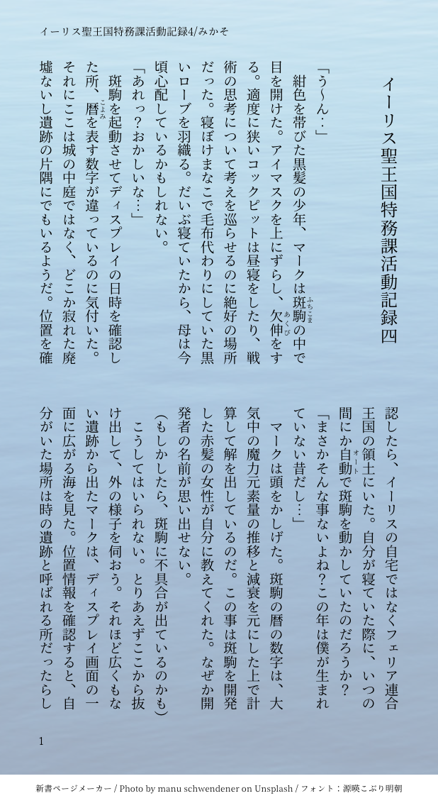 mikaso☆quiet followDONEクロル腐攻殻パロ小説、続きができました〜。今回は全年齢向けで、本編13章あたりのお話です。長くなりました笑。ルフレが男ふたなりでクロムとルフレが結婚してる&ルキナを産んだと言う設定なので、苦手な人は注意してね。 #小説 novel ##FE覚醒 #腐向け Rot show all(+8 images) Tap to full screen (size:618x1132).Repost is prohibited Let's send reactions! freqpopularsnackothersPayment processing Replies from the creator Follow creator you care about!☆quiet follow mikasoDONE更新、すごく久しぶりですが書き上げました。今回は家族の話で短めです。 2098 mikasoDONEクロム様お誕生日おめでとうございます🎉元ネタはうな◯いちどうさんです、毎度ネタ絵が多くてすみません🙇 mikasoDOODLEゴッホのアバター絵です、元はうちのこをイメージして作っています。よく本を読ませているので、自分が読んでいる本を描いてみました😀 2 mikasoDOODLE明けましておめでとうございます、今年の年賀状はFEHのレラパパです。今年もよろしくお願いします❗️ mikasoINFO新刊のBOOTH通販開始は2025/1/12以降になります、しばらくお待ちください! 7 mikasoMENU来年1/12のスパコミにサークル参加します!ポスターとお品書きを置いておきます。BL本ばかりなので、大丈夫かつお暇な方は気軽に立ち寄ってね。クロル腐新刊のBOOTH通販開始は1/12以降になります、しばらくお待ちください🙏 4 related works かほる(輝海)INFO平成最後にネップリ折本出します。A6サイズ8ページ。R18小説を二本収録。そのうち一つは、ここで公開済みの「路地でもっこりする二人の話」です。コードは29日の夜遅く(30日に日付が変わる頃)に支部で公開します。サンプルで1ページだけチラ見せ。よろしくお願いいたします。 文月ちえり&中の人MAIKING作業進捗?みたいな感じの投稿だけど、現在Newお仕事に夢中で絶賛放置中な執筆中小説の一つ。第1章の序盤で、サイトにて公開中な10,000文字の約半分相当です。#青春 #小説 #中学生 #オリジナル#自家製本 して書籍化予定です!#文学フリマ #前橋 #東京 #文フリ 出店予定 14 siro1516INFO先程お伝えした「小さな炭治郎くんと義勇さん」からのご挨拶と「お知らせ」を別で投稿です。 4 siro1516TRAINING『小さな子供との夏祭り編』2/2枚 10 kabolove22DONESSメーカーで作った小説です。 8 かほる(輝海)PROGRESSエアコミアンソロ進捗。やっと攻守交代まで来た(*´艸`*)そして、一番言わせたかったセリフまできた…あぁ満足…まだ終わらないよ(*´ω`*)肝心のセリフに字が重なってる…(´・ω・`)タップすると全部見えるようになります。 zeppei27DONEなんとなく続いている主福のお話で、単品でも読めます。七夕を楽しむ二人と、夏の風物詩たちを詰め込んだお話です。神頼みができない人にも人事を超えた願いがあるのは良いですね。>前作:昔の話https://poipiku.com/271957/11735878.htmlまとめhttps://formicam.ciao.jp/novel/ror.html 3654 starareorangedrDONE恭龍の小説(まだつきあってない) 3 ももみつDONEマターさんとクラフターさんの、日常の一コマ話。小説。 9 recommended works はなまるFXDONE夢が膨らむわ♪ サンマの蒲焼DONE年賀状とさっき上げたオリジナルの加工前…サイズが小さかったので 2 わさびなゆきDOODLEみずあめ まち🦍DONEポスカにしました 中落ちカルベイベDONEとってもバレンタイン2020③〜いえい!〜 うぇりDOODLE猫の日和泉ちゃん jun2900DOODLEいろいろ練習に 雁坂みちDONE「零れたミルクは戻らない」編集してたらデータがバグりました、再投稿すみません…多分一巻の表紙になる twilight_topazTIRED施施―犀国秘史― まで決めて四年くらい放置してます……王の纏足文化のある犀国の太子×宦官の愛人です。 3