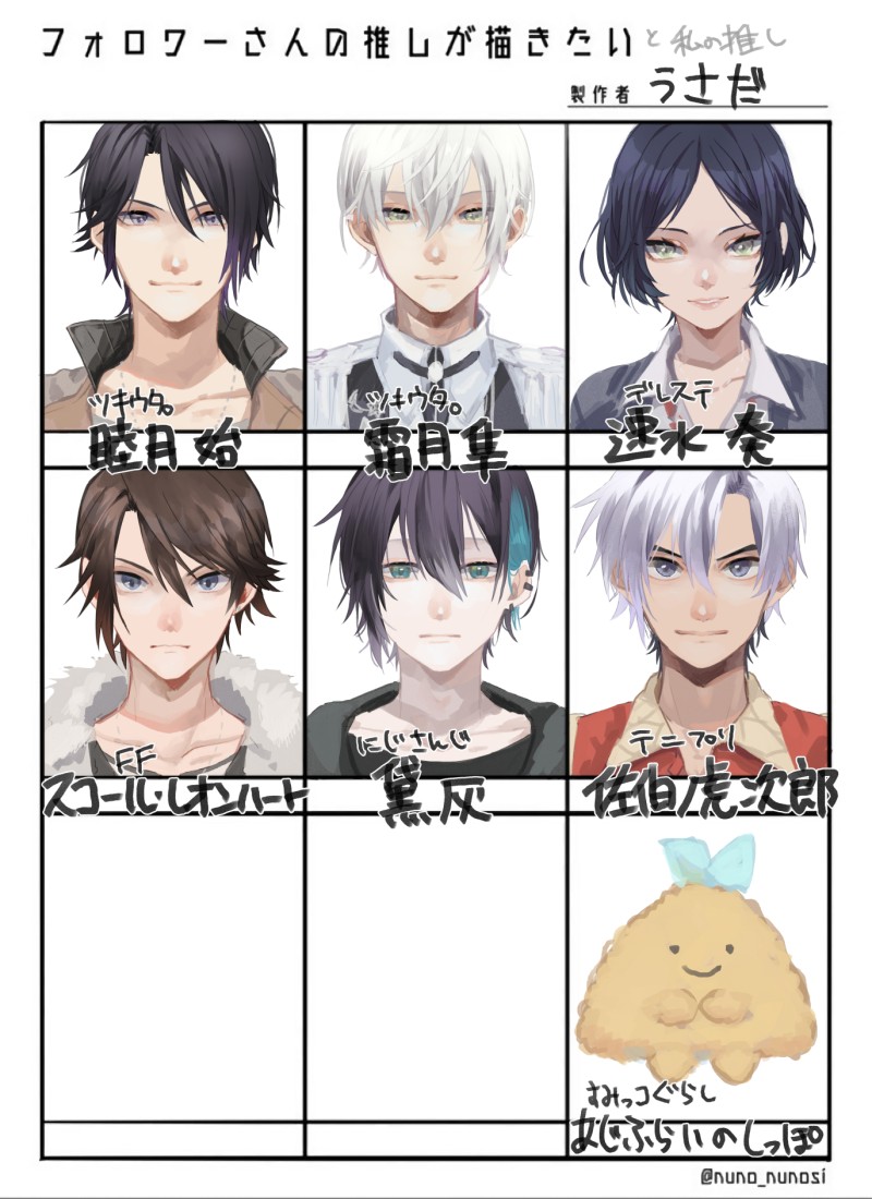 うさだ。☆quiet followDONE Tap to full screen (size:1372x1888).Repost is prohibited うさだ。REHABILI2025/10/23リハビリと色塗り練習 うさだ。DOODLE2025/06/20クリスタの線画練習 うさだ。DONE2025/05/14祈願絵 うさだ。PROGRESS祈願絵 うさだ。PROGRESS うさだ。DOODLE2025/04/18アニメみた記念 recommended works こよみTRAININGこよみんちの獠で「アパート」と「シンデレラ」のお話はどうでしょう? 2ツイート(280字)程度だと嬉しいですっ!#CHしたったー #shindanmakerhttps://shindanmaker.com/965157字数、倍だなwいいの、「だといいな!」っていう字数だから←「シンデレラ」の使い方を悩んでますが、諦めた!素で変化球思考なんです…。お題物は難しいです💦 aosabikinakoTRAINING貴方はアオ相で『しゃらっぷ、きすみー!』をお題にして140文字SSを書いてください。#shindanmakerhttps://shindanmaker.com/375517 aosabikinakoTRAINING貴方はハル相で『色気のない誘い文句』をお題にして140文字SSを書いてください。#shindanmakerhttps://shindanmaker.com/375517ハルトくん視点だと色気を無くせなかったので、相談員さん視点で。 MaidMerongDONESSR スクール水着(紺)Lv27能力:重力結界無効 いちず🍊DOODLEあなたはゾロナミの「……ひょっとしてそれって俺(私)?」という台詞を使った1コマ漫画を描きます。#この台詞を使って1コマ漫画 #shindanmakerhttps://shindanmaker.com/524501言わなそうで言わなそうで逆に言ってたら最高。多分ナミさんが「ゾロはおモテになりますもんね?そういう人はちょっと(安心できないから嫌)」みたいなことを言っててみたいな ramnim らむDOODLE最近の推し達💕 2 みみみTRAINING貴方は萌えが足りないと感じたら『好きすぎて顔がまともに見られないみみみのヒガアス』をかいてみましょう。幸せにしてあげてください。#shindanmakerhttps://shindanmaker.com/524738 4 ネギコDOODLE一枚目創作・百足二枚目診断結果からイメージネギコさんがアンパンマンに出演した時の名前は「芋焼酎坊や」です#あなたのアンパンマンの名前 #shindanmakerhttps://shindanmaker.com/727550 2 AI8ak8cDOODLEシチュお題でお絵描きったーあなたは30分以内に4RTされたら、足の甲にキスをするさぶななの絵を描きます。#shindanmaker背後注意ってほどでもないけど不健全注意!