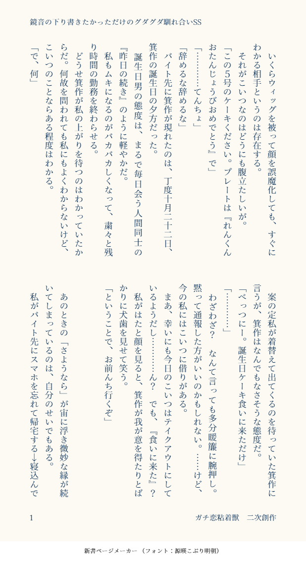 Jane_Na_Doe☆quiet followDONE折角箕作蓮くんのお誕生日なのでお誕生日のお話を書こう! と思ったら思ったよりグダグダになりました。許してください。のミツ小夜です。何故か、展示品に入れてなかったSS https://twitter.com/Jane_Na_Doe/status/1709925473655083033 と地続きの話なりました。一応読んでなくても読めるが。 show all(+4 images) Tap to full screen (size:618x1132).Repost is prohibited Let's send reactions! freqpopularsnackothersPayment processing Replies from the creator Follow creator you care about!☆quiet follow Jane_Na_DoeMAIKING隆小夜(現実)の書きかけ的なサムシング。もっとブラッシュアップもしながら書くべきかも。 8782 Jane_Na_DoeMOURNING猥談です。 505 Jane_Na_DoeDONE宇隆(割と宇←隆かも?/あと奈緒琴がイチャ)SS書いたよー!カレハさんとのリクエスト交換で、大なり小なり性的なのってことだったのでちょっと性です! 5426 Jane_Na_DoeDOODLE聖亜とのクロスオーバーは健全ネタにしたけどそれはそれとして子猫時代明智のえっちピクチャは見たかったから別途描いた。成人向け抱き枕程度のイメージです。2年生くらいの顔かもだし、お胸は盛りすぎたかも。(聖亜とのクロスオーバー: https://x.com/Jane_Na_Doe/status/1899161202653298935 ) Jane_Na_DoeDONE小夜にまだ思うところがありちょっと引きずったところがあるような隆文の夢の話です。ややギンガ→624498_g。引き寄せ耳元囁きのときの心情について『思い入れがある故に余計なことをした』のパターンの解釈を採用してます。 5179 Jane_Na_DoeDOODLE【エログロ注意】たかふみさんの見る悪夢の中のたかさよ落書きまんが。グロ優勢エログロ。二人の相性の悪い部分全開。無限の献身をおそれるタイプだと思うので。寝る前にと思ったら朝になっていたので時間帯にそぐわずごめん。最後らへんは力尽きです。 3 recommended works BeMelody1DOODLE刃x枫和恒密码18↑?(y/n) 2 murahoshi_eezPROGRESS👯♀️女装注意🍁くんが性癖破壊される漫画を描きたかったんですが、よく分からないものになってしまった…🐳くんは女装する時乳首が浮くのは良くないとかうっかり乳首が出たら良くないみたいなって知識だけあってとりあえずチクバンしてるのかもしれない🍋ちゃんは乳首もヘソもないと嬉しい 2 screamwandererPROGRESS barkDOODLEmk: bulonrobot 10 komekashi_kaniDOODLE💤🦊👉👌👈18↑?(yes/no) teki-shikaDOODLE昨晚的哎卧槽这男的咋这么坏,草一下 3 葵琥珀DONE【拷問】くすぐり責め拘束して抵抗出来ない様にしてから、くすぐったい場所をくすぐる。遊びのイメージあるけれど、長時間くすぐられるのはかなり辛い。 🐥🌈#ConiConi。🍳DOODLE今まで描いた動画以外の曲パロまとめ 21 38mian_nwMEMO2025/01/11CoC『お前が猫耳メイドになるんかい』KPC/KP:落田 七光/もぐしたさん PC/PL:小野槍 杢河/マャEND えもえもにゃん にてシナリオクリアなん……だったんだ……